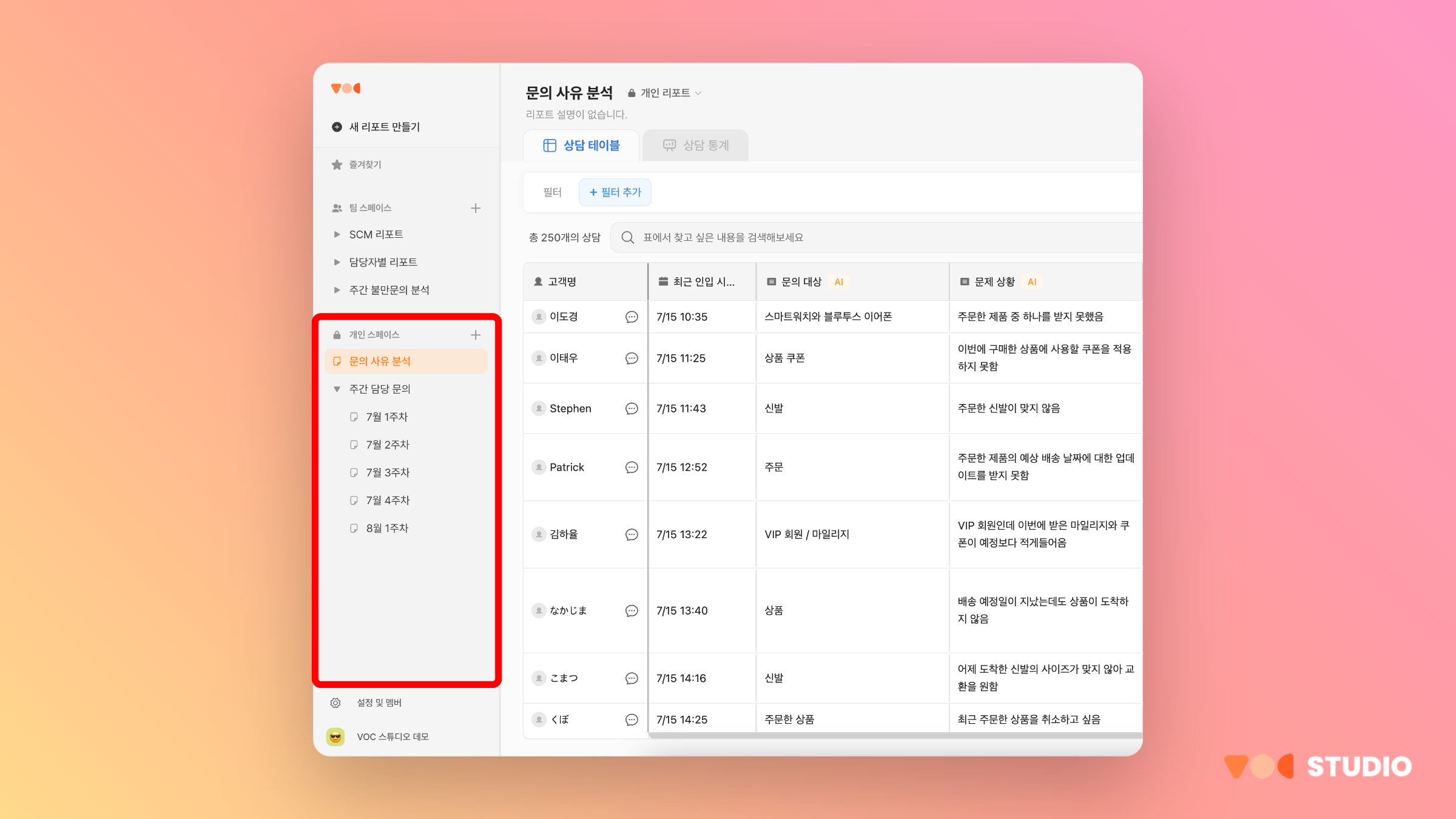 팀원을 VOC STUDIO 에 초대해 팀 스페이스에 있는 리포트를 공유해보세요!