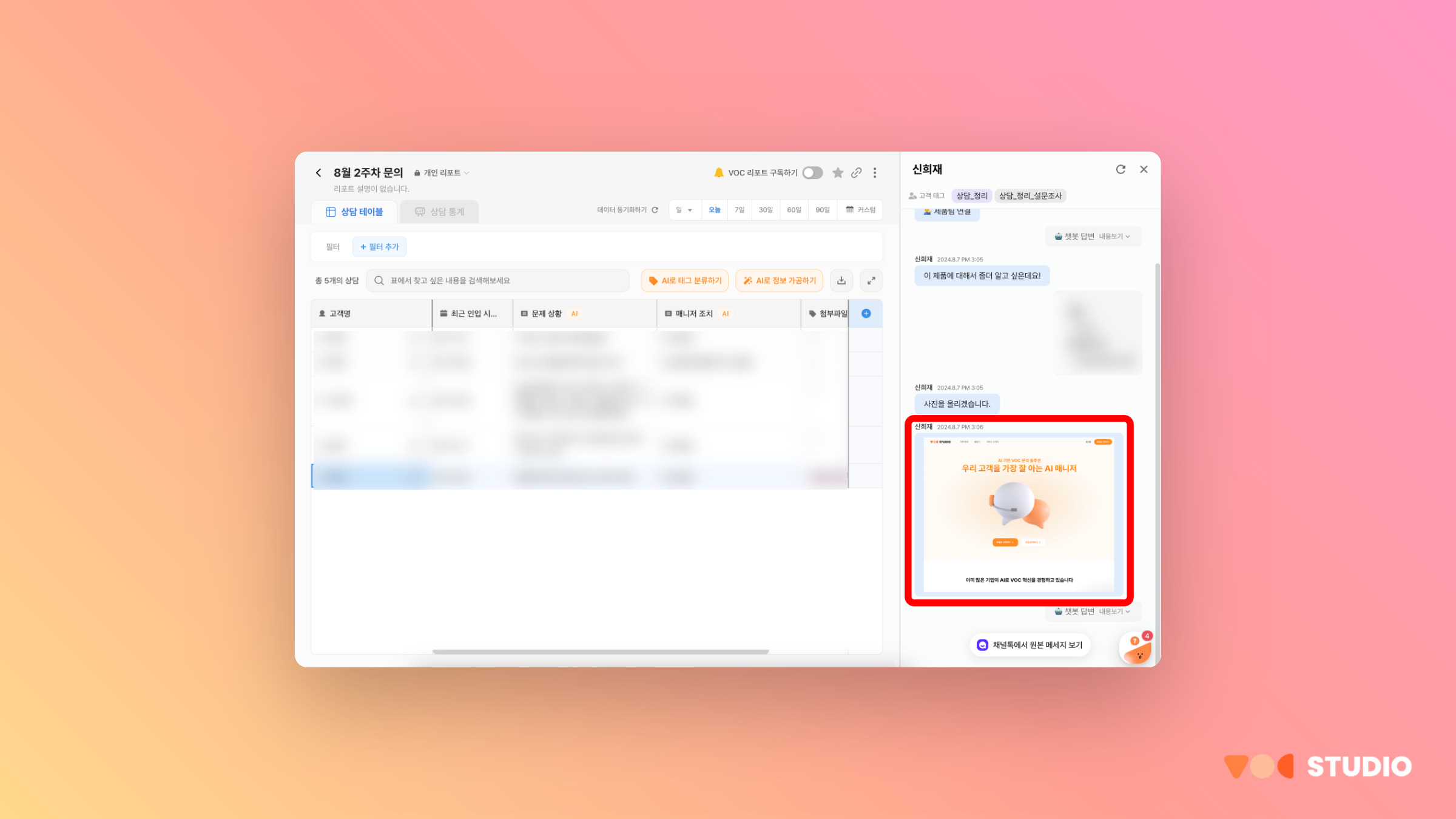 채널톡 상담 내 이미지 파일을 VOC STUDIO 에서 바로 확인할 수 있어요.