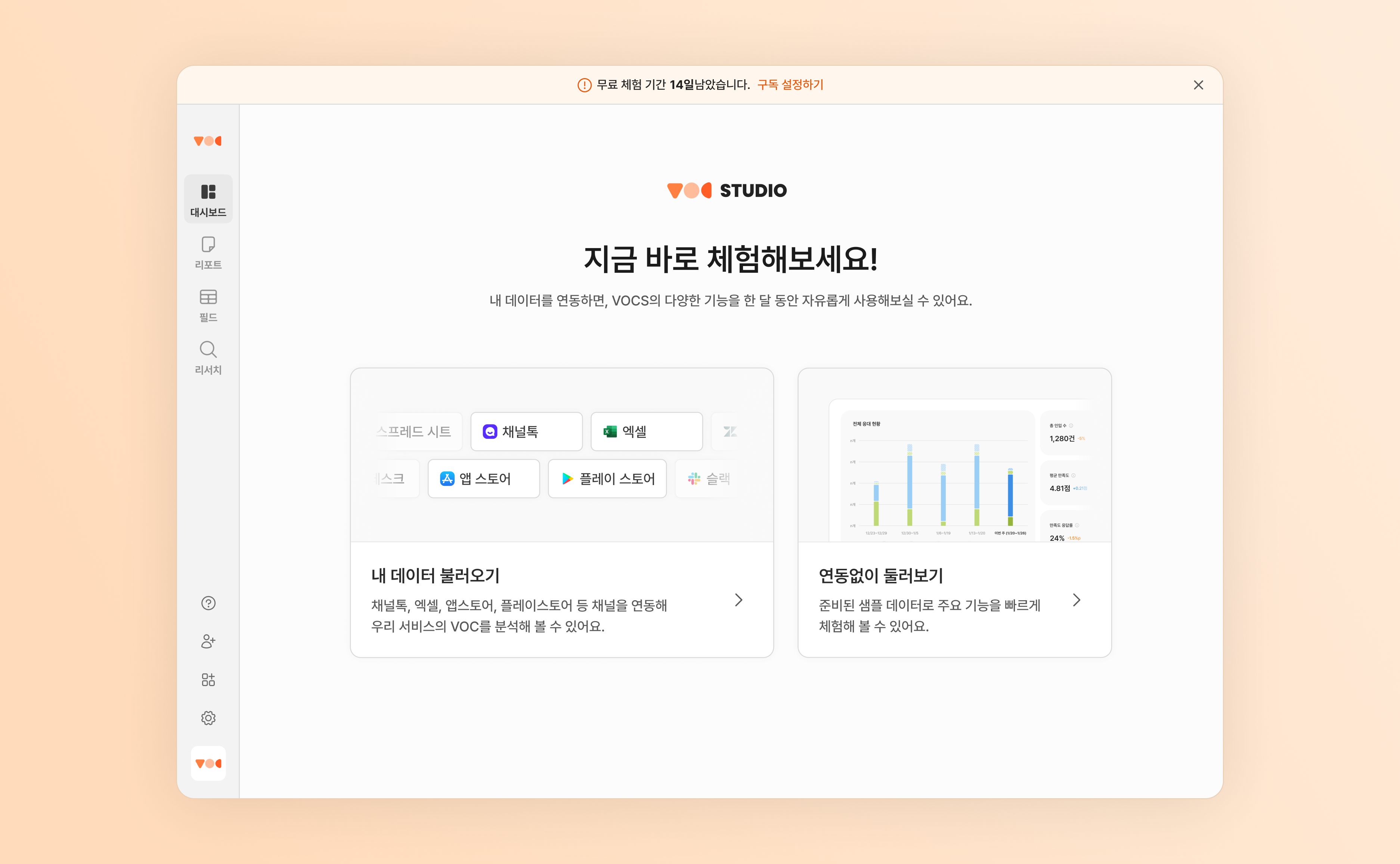 준비된 샘플 데이터로 리포트, 리서치 등 VOC STUDIO의 모든 기능을 즉시 체험해 볼 수 있습니다. 팀에 적합하다고 판단되면 이후 연동을 진행하면 됩니다.