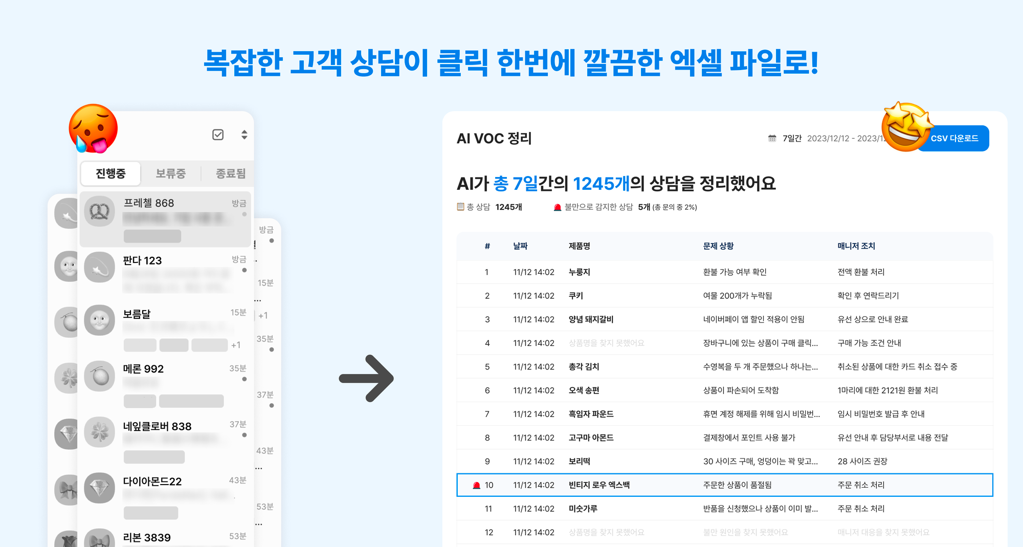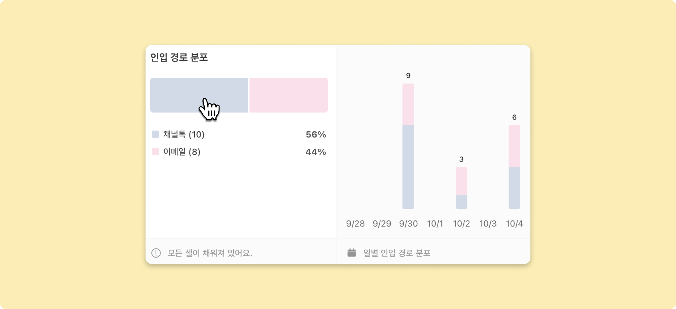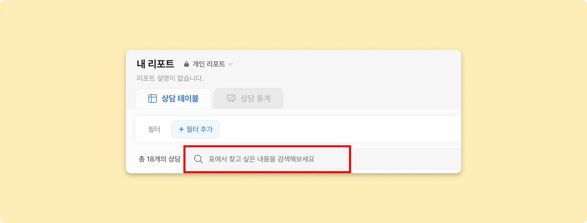 인입된 문의들과 각 문의에 관한 각종 정보를 담은 필드(field)들이 모여 상담 테이블을 이뤄요. 하나씩 관리하기 힘들었던 데이터들을 익숙한 테이블의 형태로 한 곳에서 모아 볼 수 있어요.