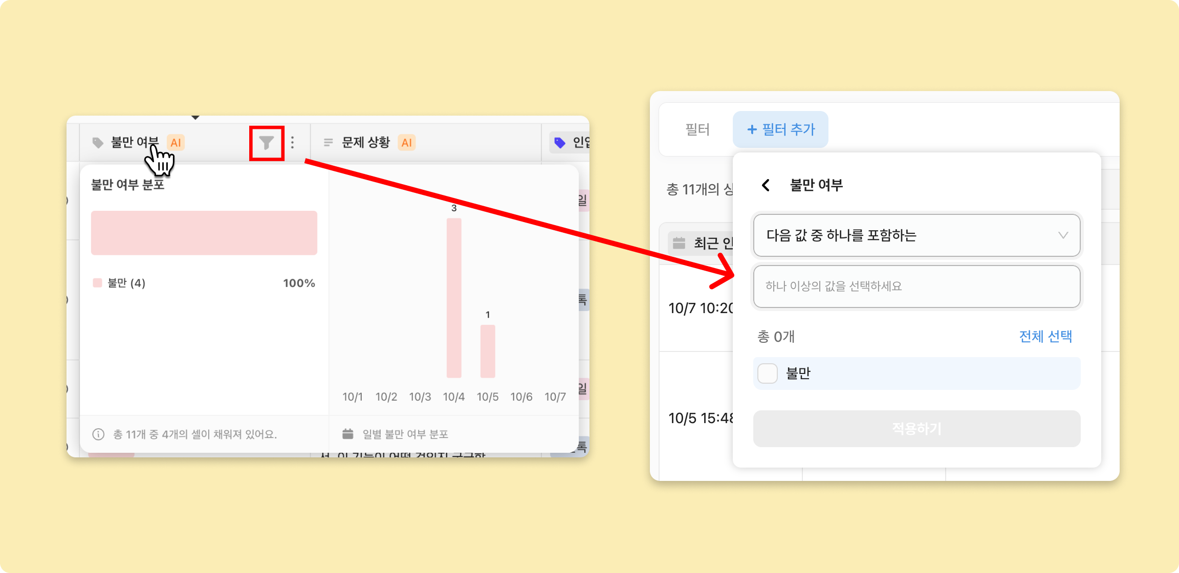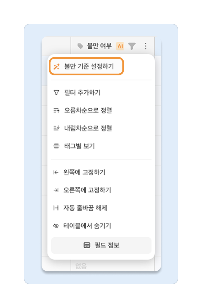 A. 불만 여부 필드 헤더를 클릭하고, 불만 기준 설정하기 를 눌러서 바꿀 수 있어요.
