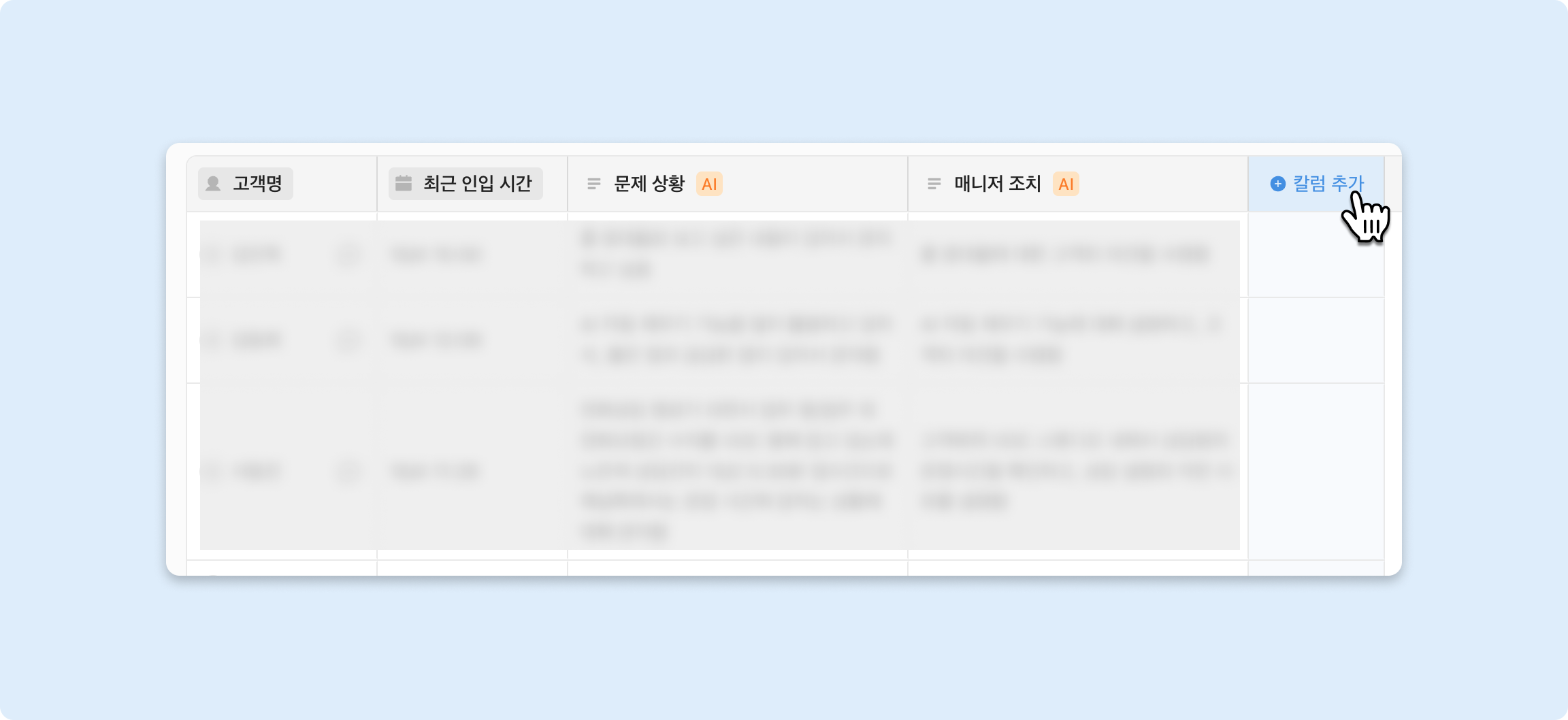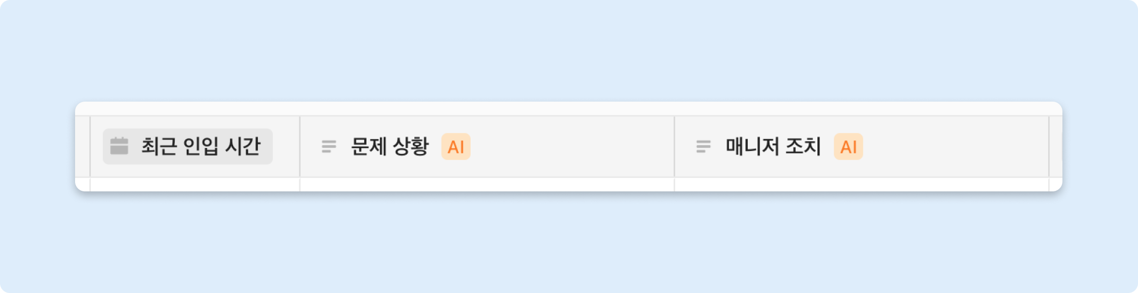 새로운 문의가 인입될 때마다 AI가 내용을 자동으로 분석해 테이블을 채워줘요. AI가 자동으로 채우는 필드는 4개가 있어요.