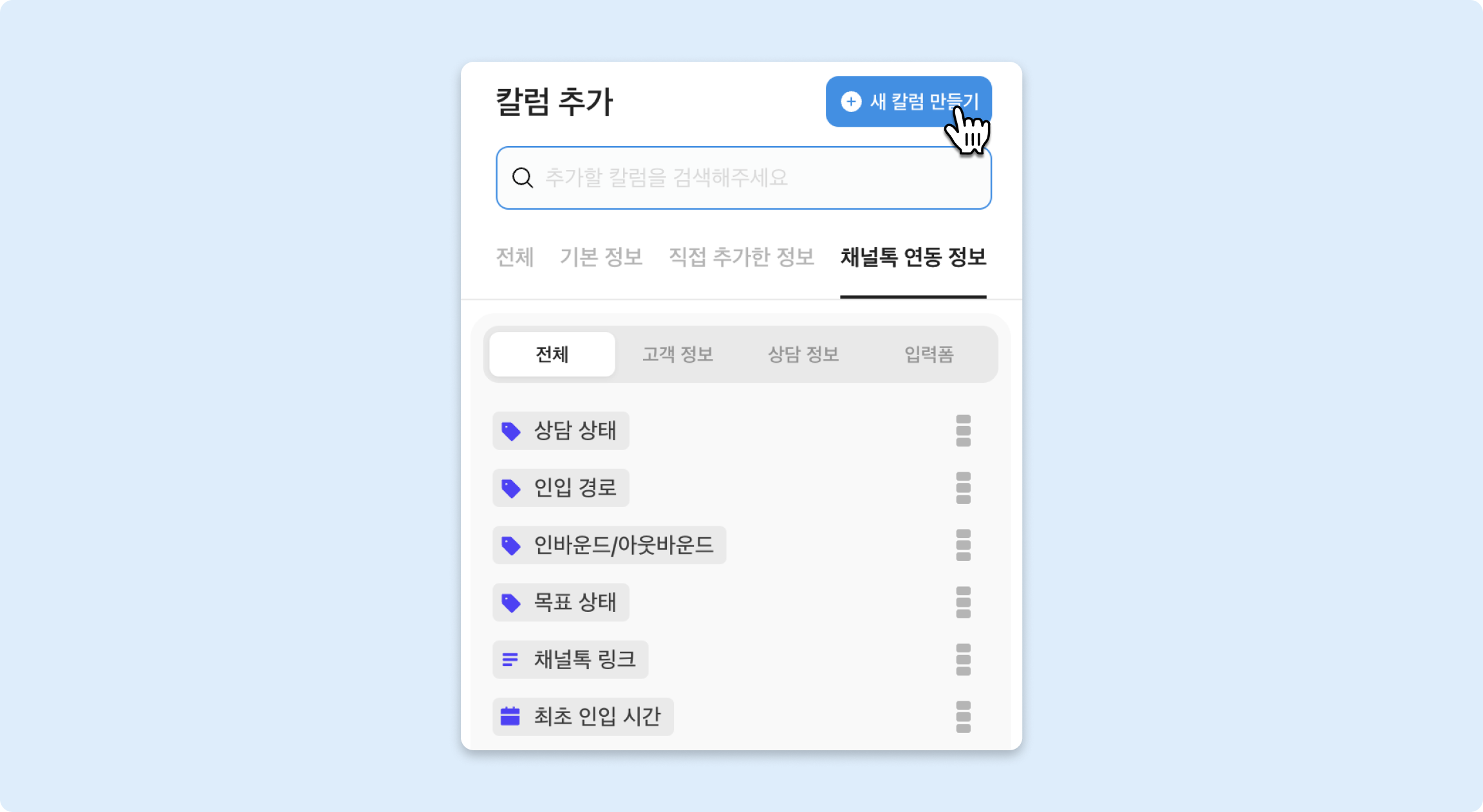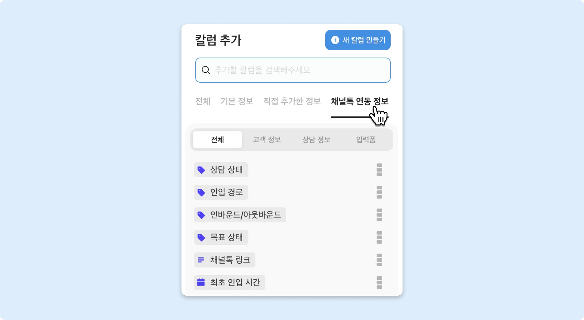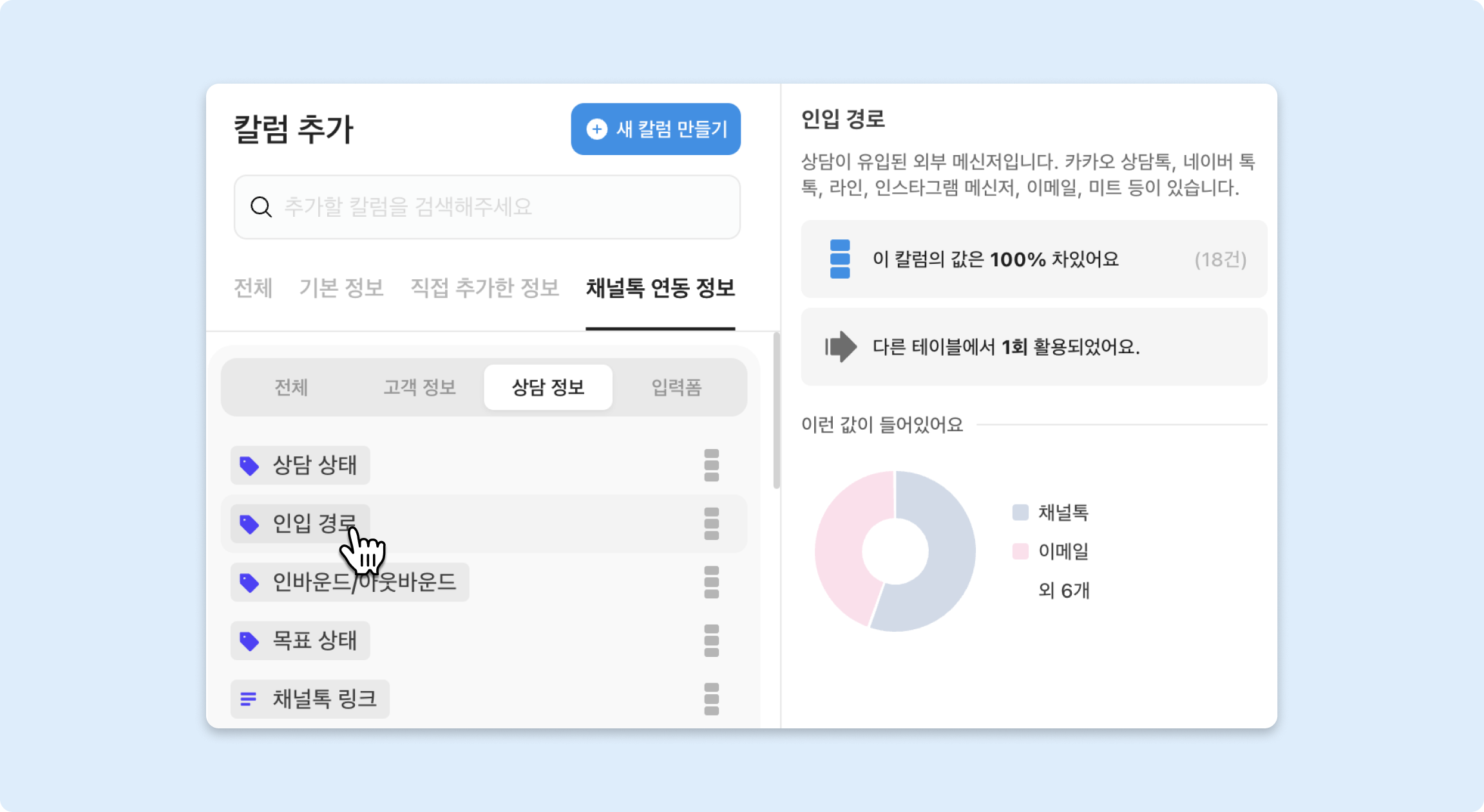 고객 정보, 상담 정보, 입력폼 내용 등 원하는 정보를 찾아 선택하면 테이블에 추가할 수 있어요. 필드 이름에 마우스를 올려두면 값이 얼마나 채워져 있는지, 어떤 내용들이 들어 있는지를 간단히 확인해볼 수도 있어요.