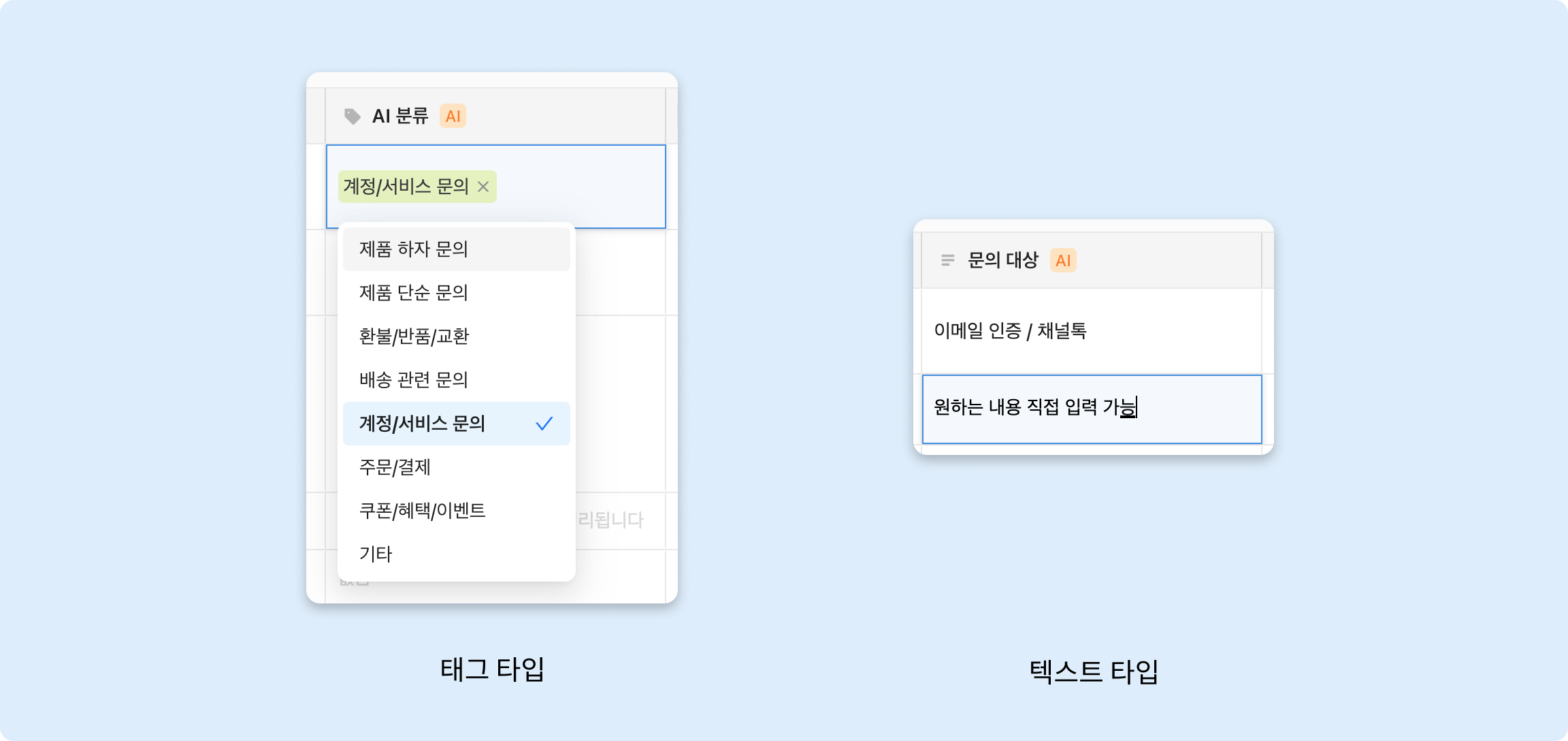 A. 원하는 문의 유형을 자동으로 분류하려면 AI 자동 채우기 를 활용해주세요. 우리 회사 상황에 맞는 태그와 분류 기준을 자유롭게 설정할 수 있어요.