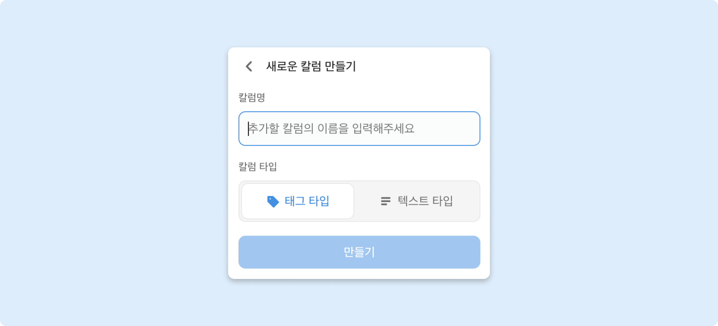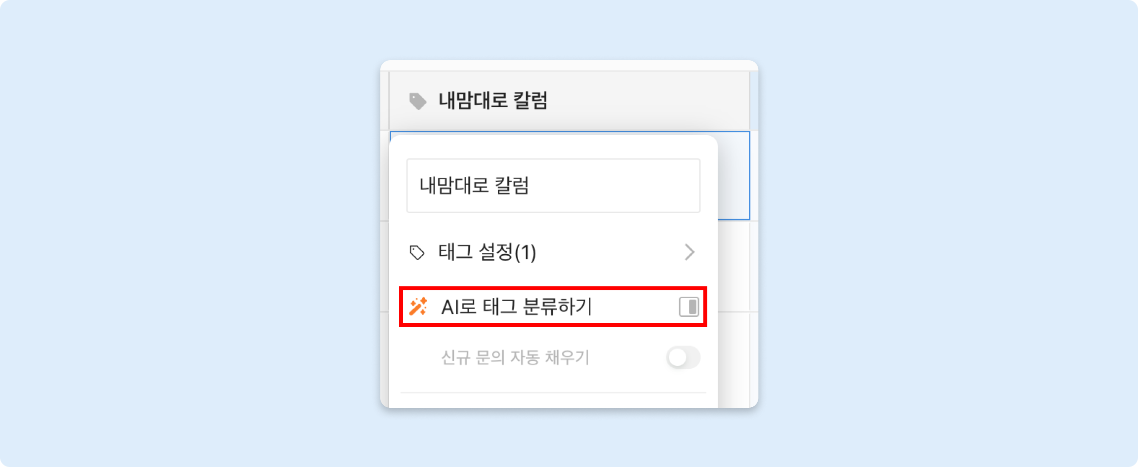 칼럼 이름을 클릭하면 나오는 메뉴에서 AI로 태그 분류하기를 선택해 원하는 기준에 따라 칼럼을 자동으로 채울 수 있어요. 자세한 안내는 AI 자동 채우기 사용가이드를 참고해주세요!