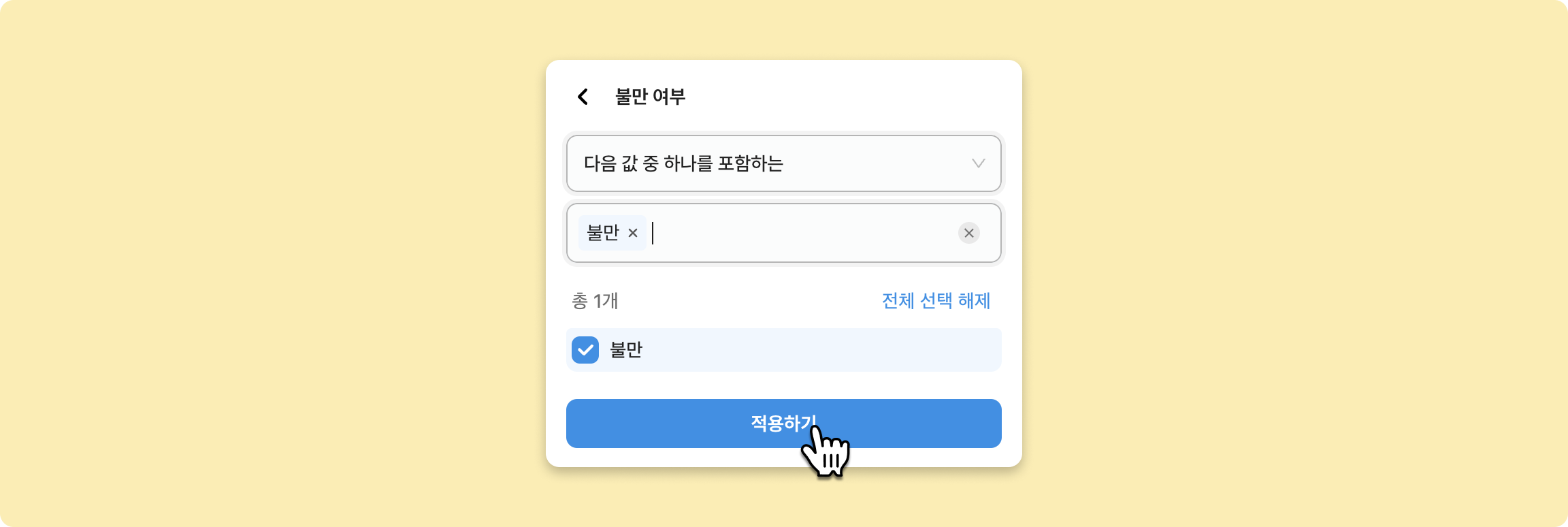 다음 값 중 하나를 포함하는, 포함할 값으로불만을 선택한 뒤적용하기버튼을 눌러주세요.