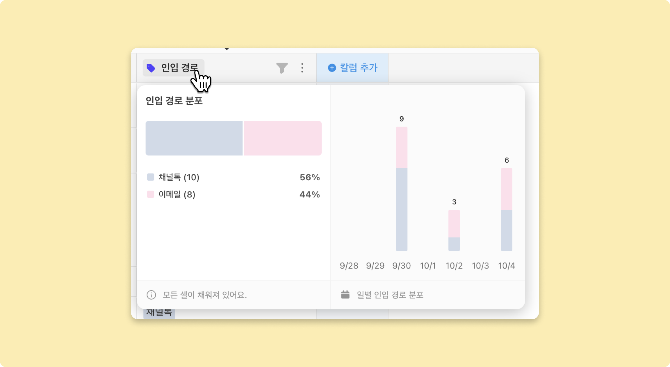 태그 타입 필드라면 더 쉬운 방법도 있어요! 테이블에서 태그 타입 칼럼의 제목에 마우스를 올리면 그 필드의 내용을 간단히 보여주는 차트가 나타나요. (태그 타입 필드가 아닐 경우 나타나지 않아요.)
