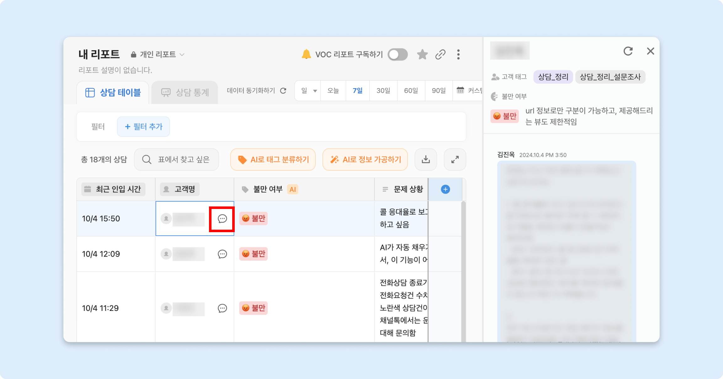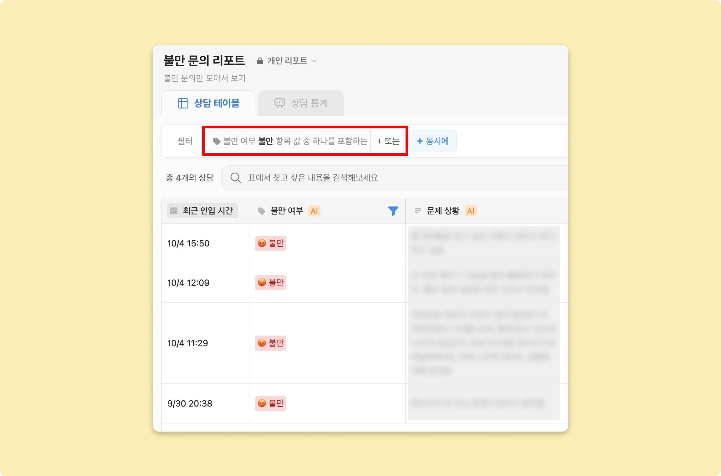 짠! 필터가 적용되면서 불만 문의만 모아놓은 리포트가 완성돼요.