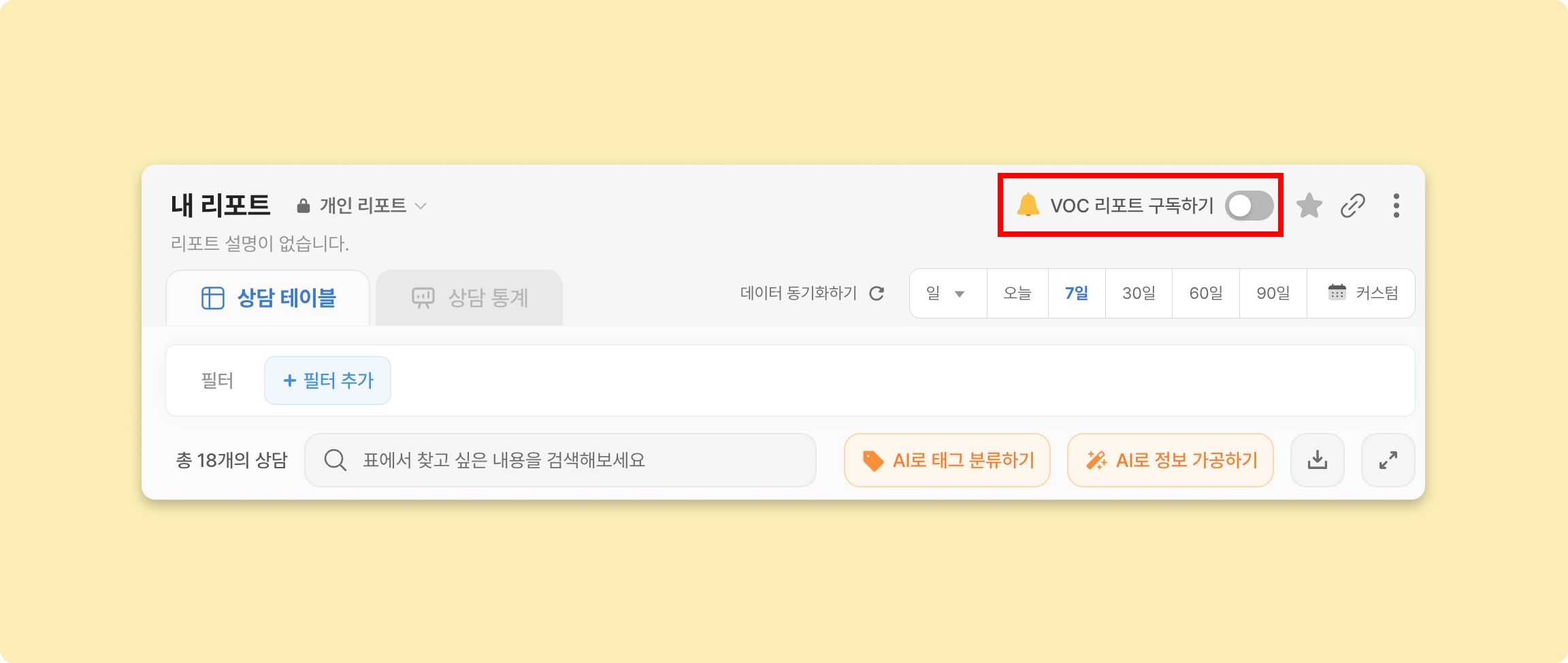 리포트 화면 상단의 리포트 구독하기 옵션을 켜면 새로 인입되는 상담을 정리한 요약본을 주기적으로 받을 수 있어요. 매번 리포트에 접속할 필요 없이 중요한 내용을 메신저로 받을 수 있고, 다른 팀원들에게 공유하는 것도 훨씬 쉬워져요.