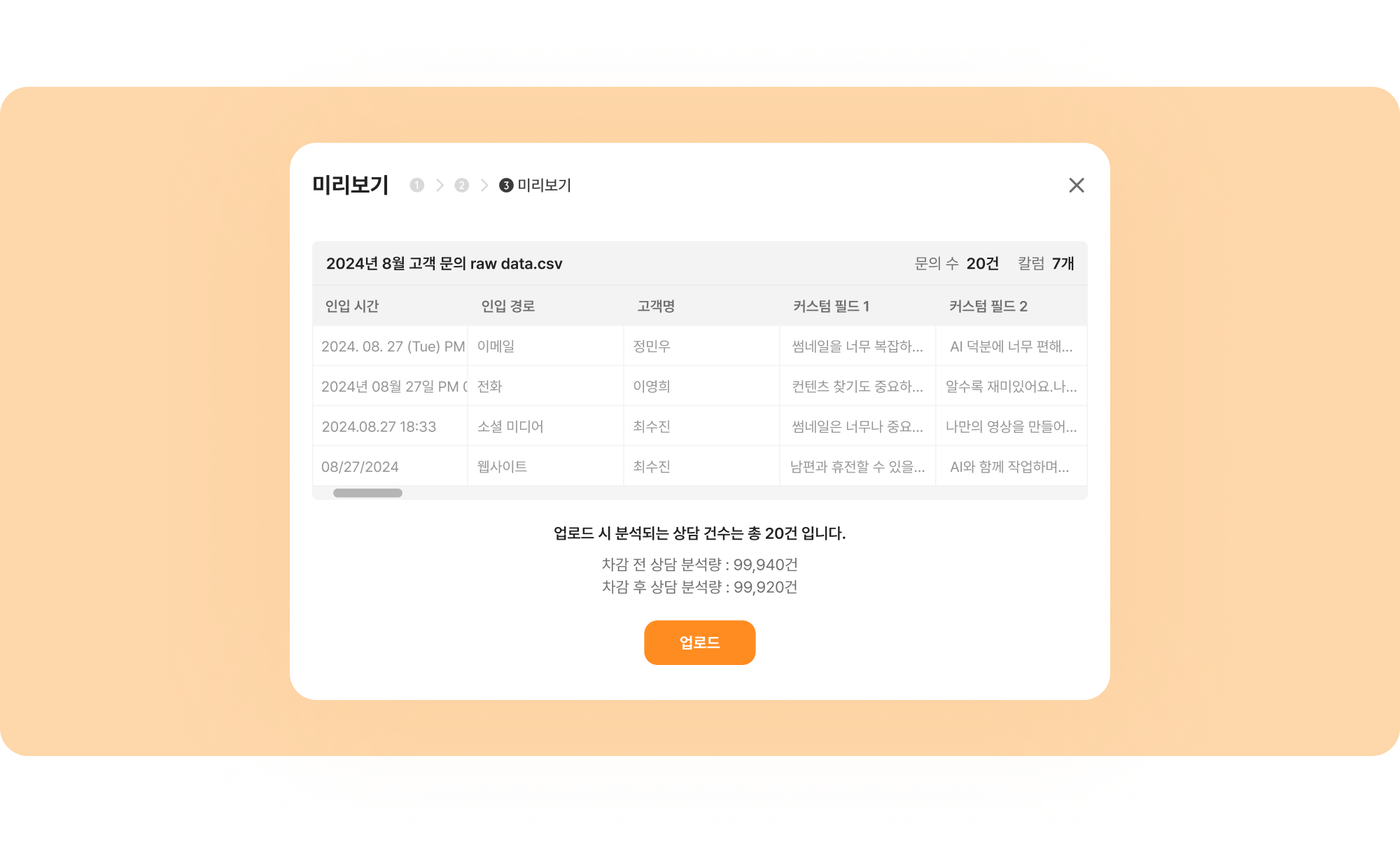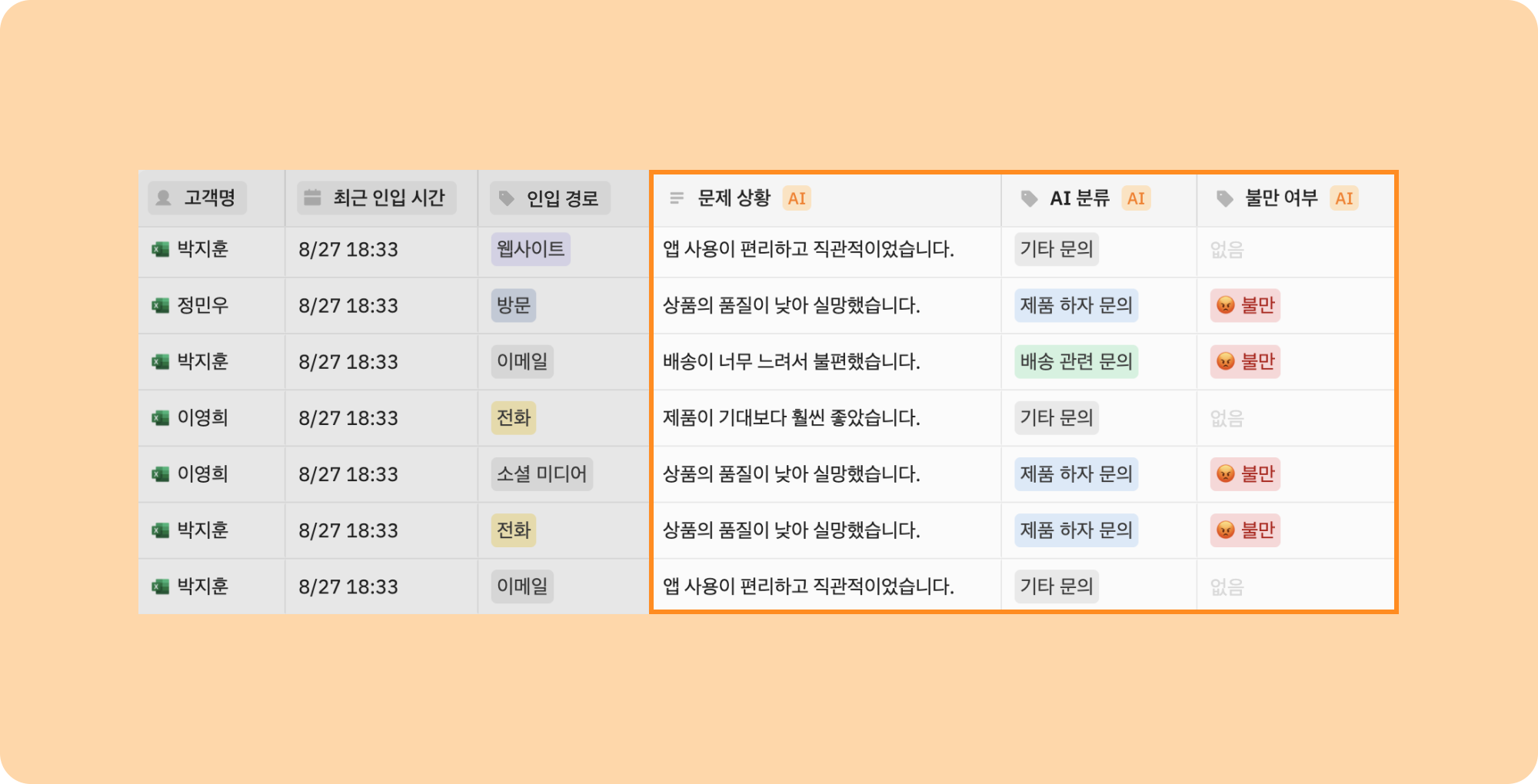 파일을 업로드하면 AI가 자동으로 내용을 분석해줘요. 상담테이블에서 확인할 수 있는 '문제 상황', 'AI 분류', '불만 여부' 등 칼럼의 내용이 동일하게 채워집니다.