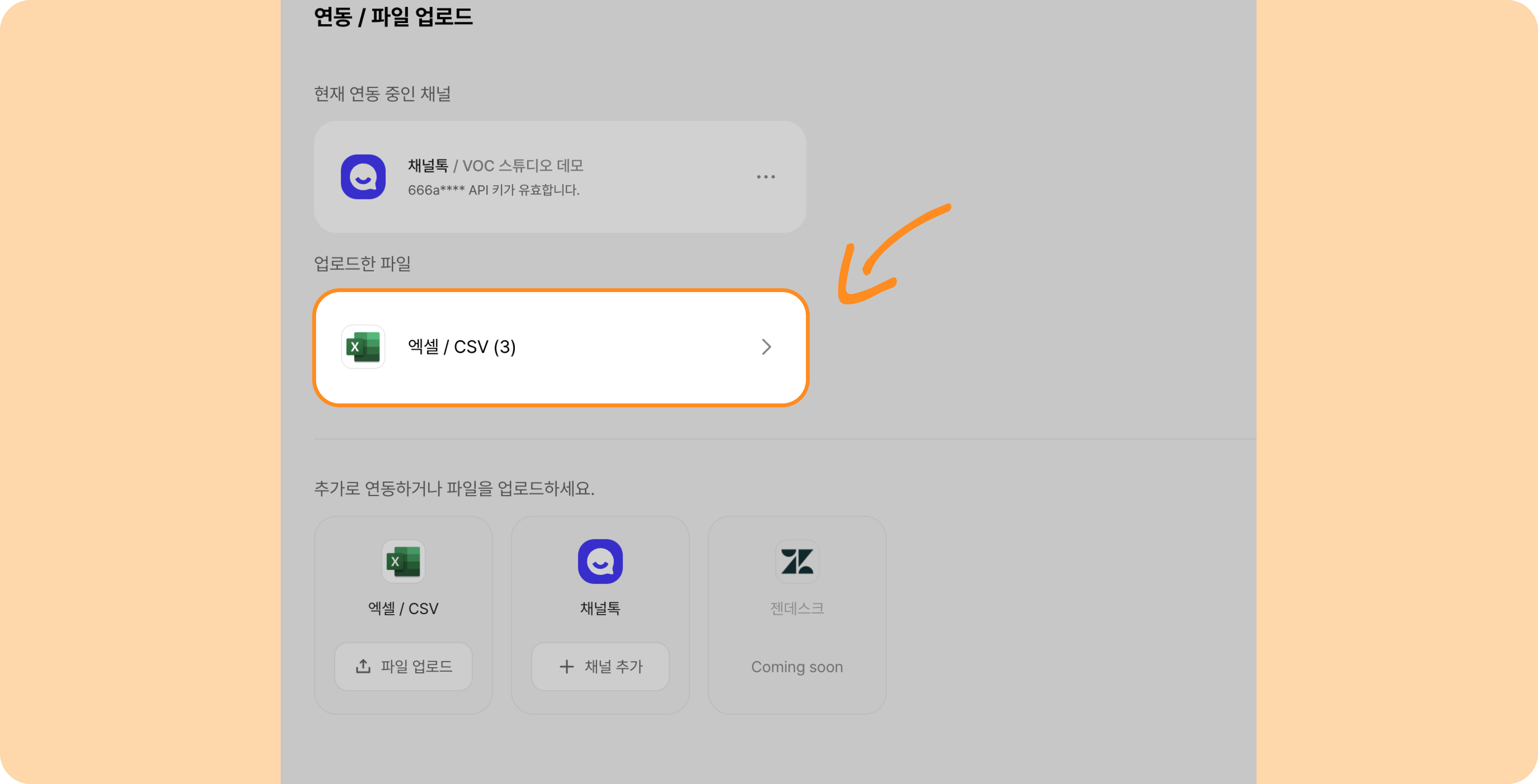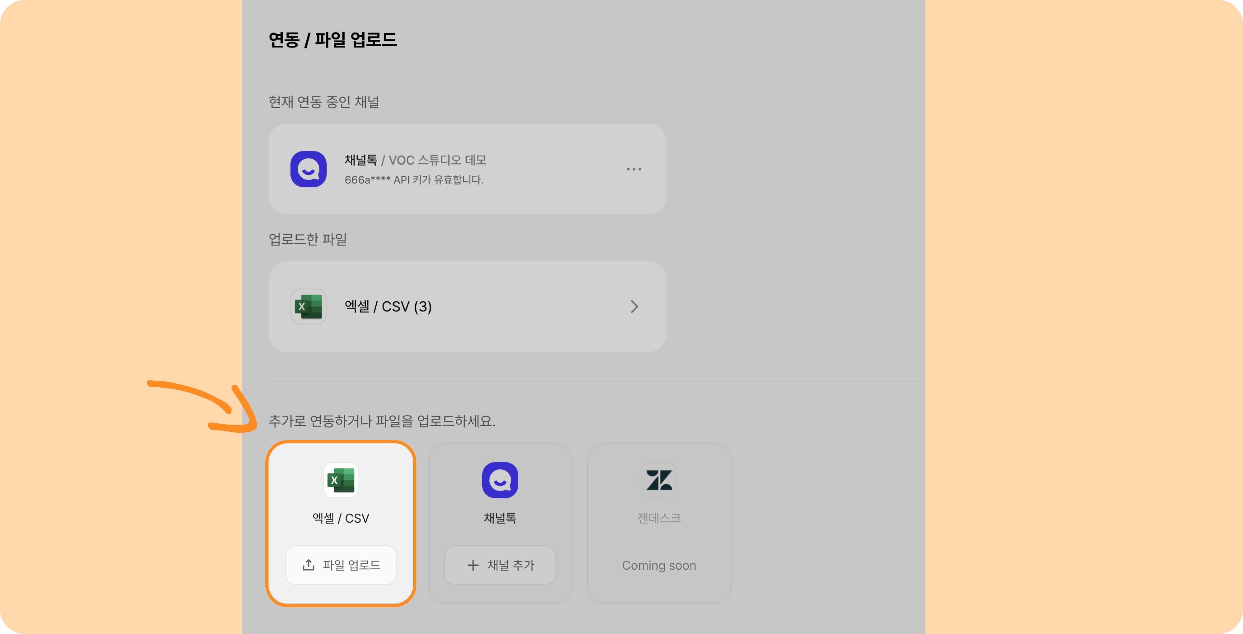 설정 > 연동 / 파일 업로드 메뉴를 클릭 후, 이미지 속 [파일 업로드] 버튼을 눌러주세요.