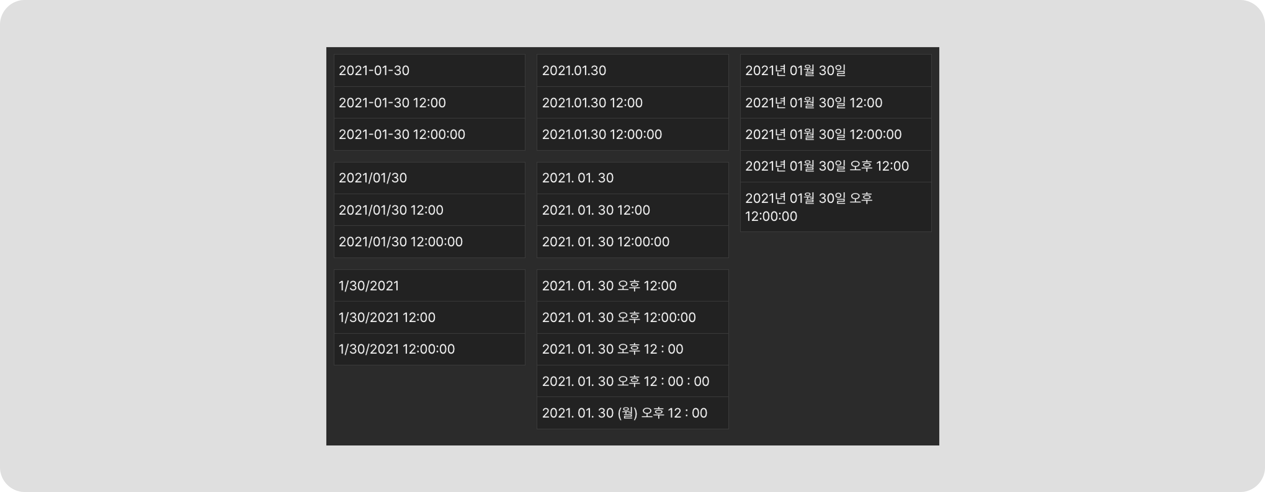 * VOC STUDIO에서 지원하는 날짜/시간 데이터 포맷은 다음과 같아요