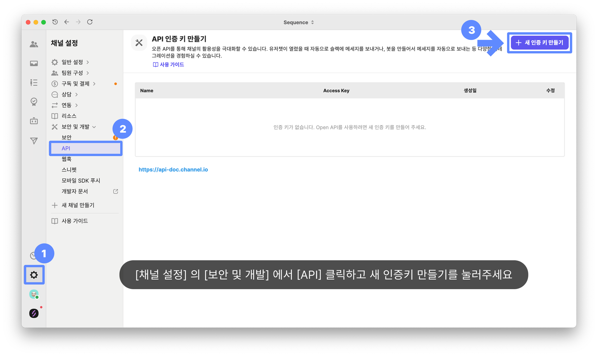 설정 경로: [채널 설정] - [보안 및 개발] - [API] 클릭
