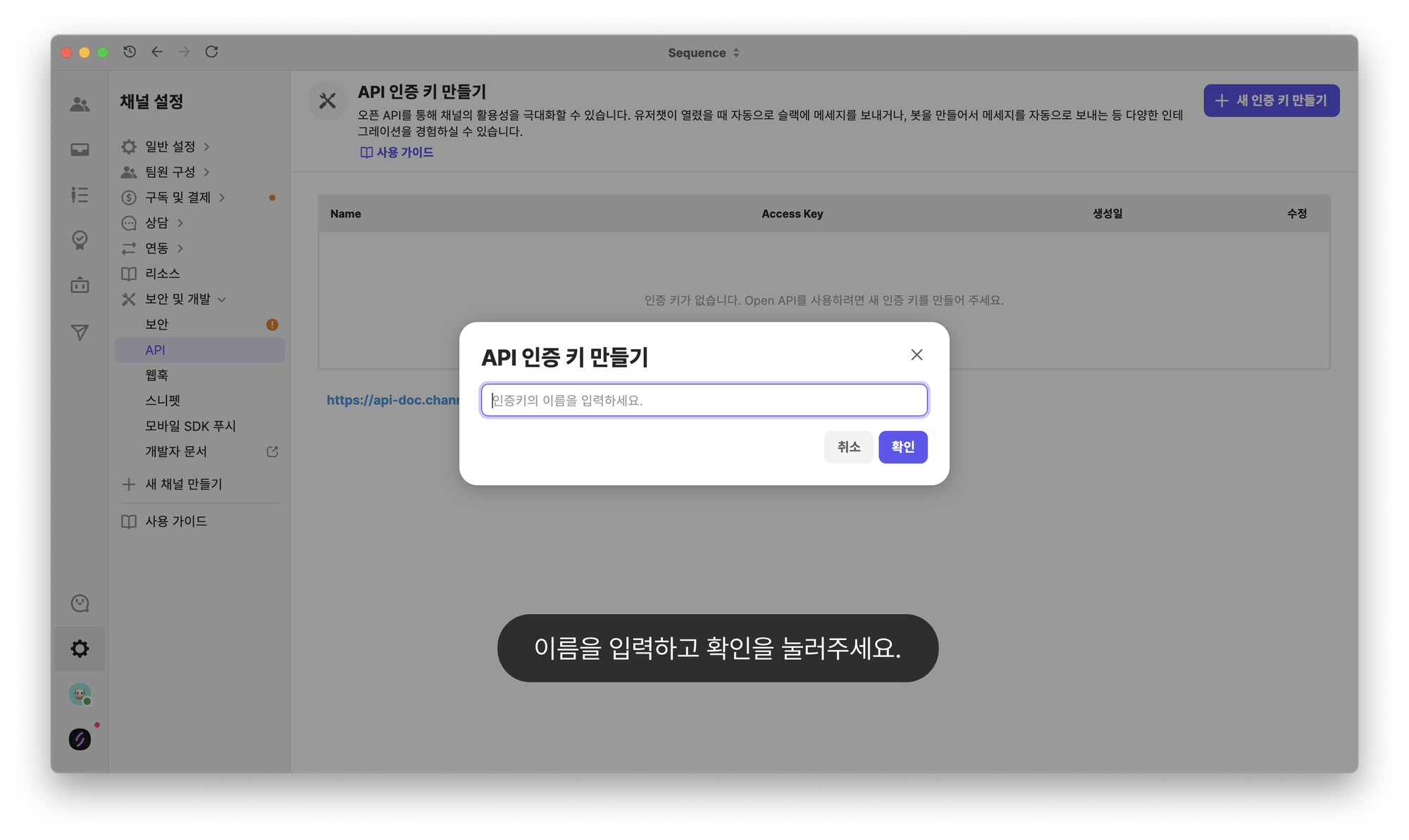 원하시는 이름을 입력하고 [확인]을 눌러주세요. (Ex. VOC STUDIO 연동 키)