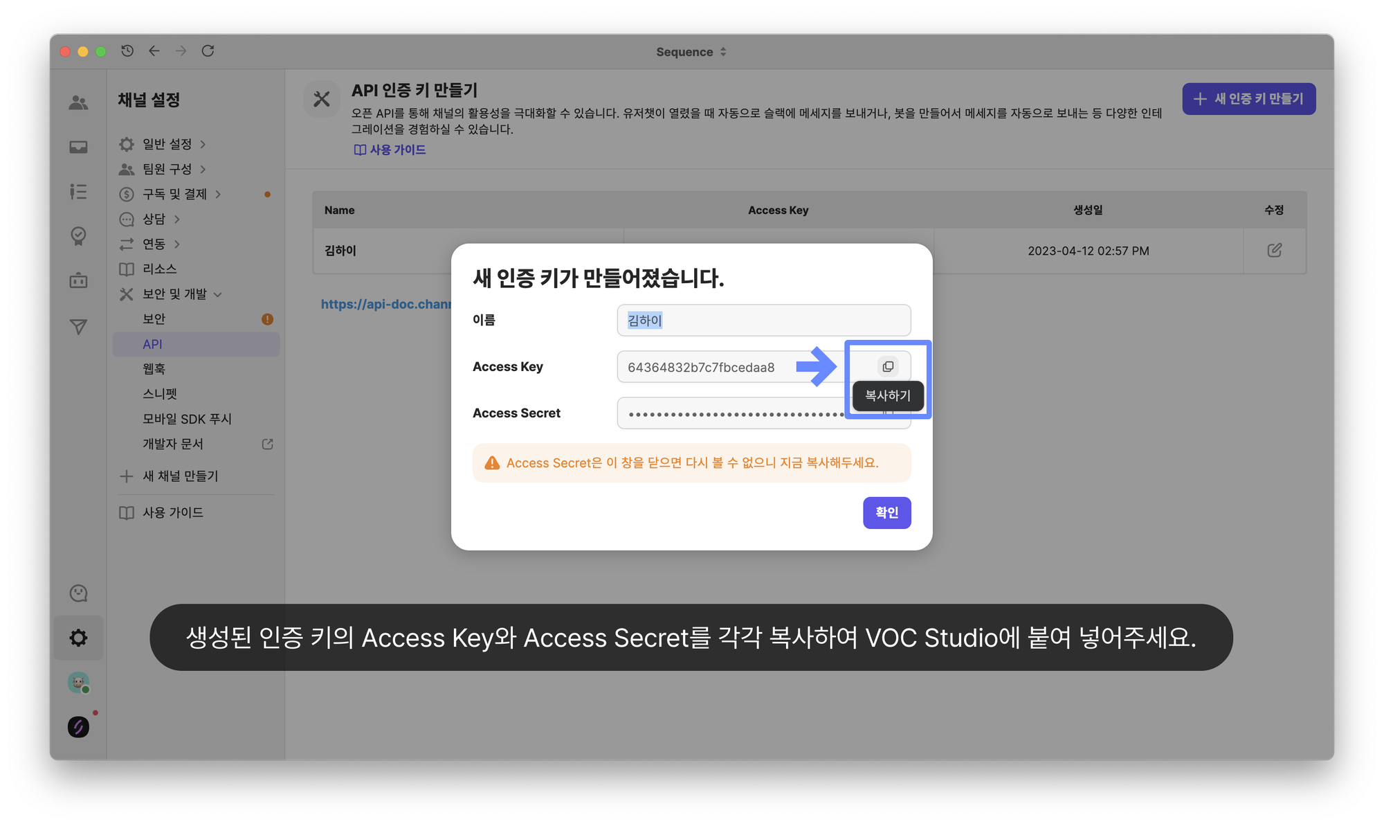 생성된 인증 키의 Access Key와 Access Secret를 각각 복사하여 VOC STUDIO 연동 페이지에 붙여 넣어주세요.