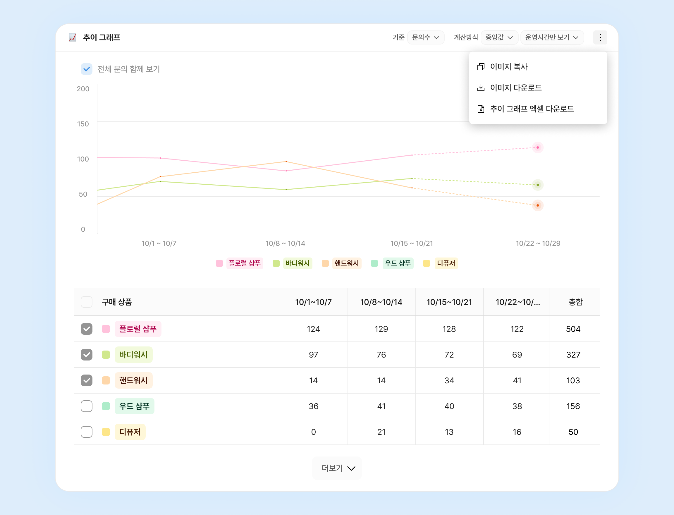 뿐만 아니라 상담 통계 탭에서 각 태그의 개수와 비율, 변화 추이를 볼 수 있어요.