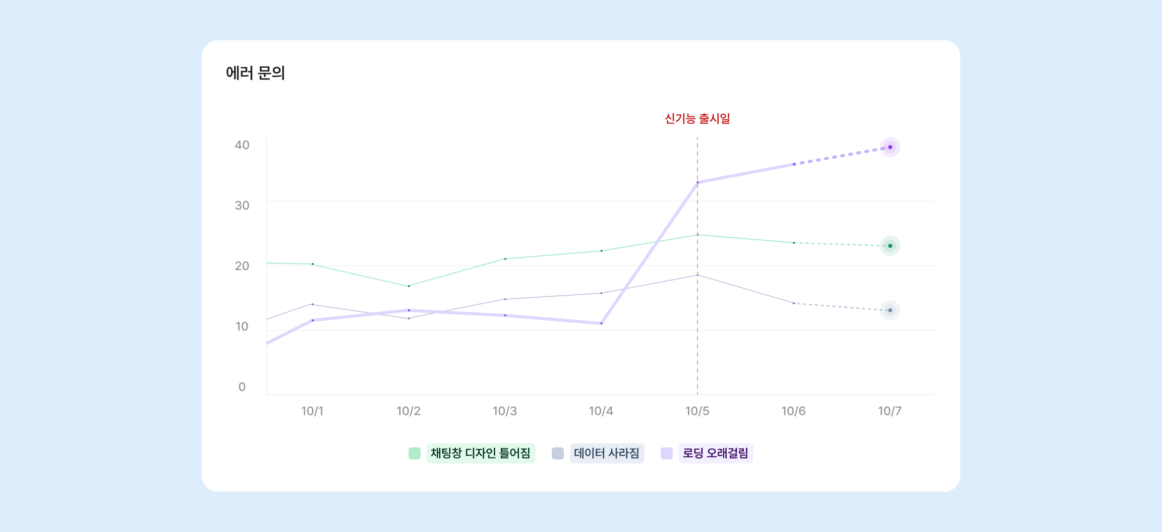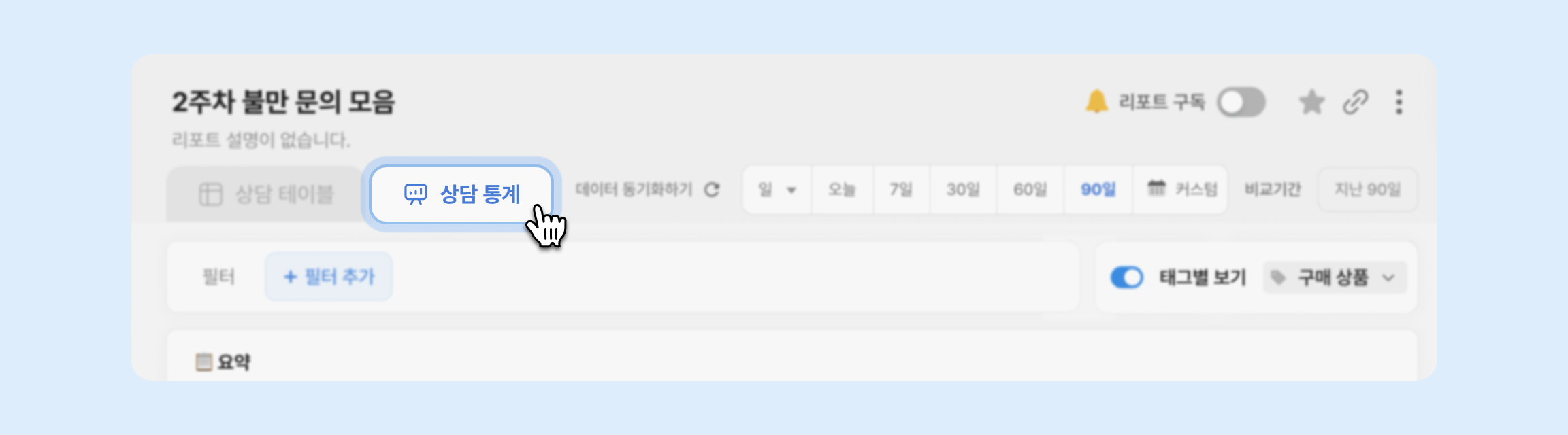 에러/ 버그 관련 제보를 태그로 관리하고 계신가요? 상담 통계 탭에서 추이 그래프를 살펴보세요.