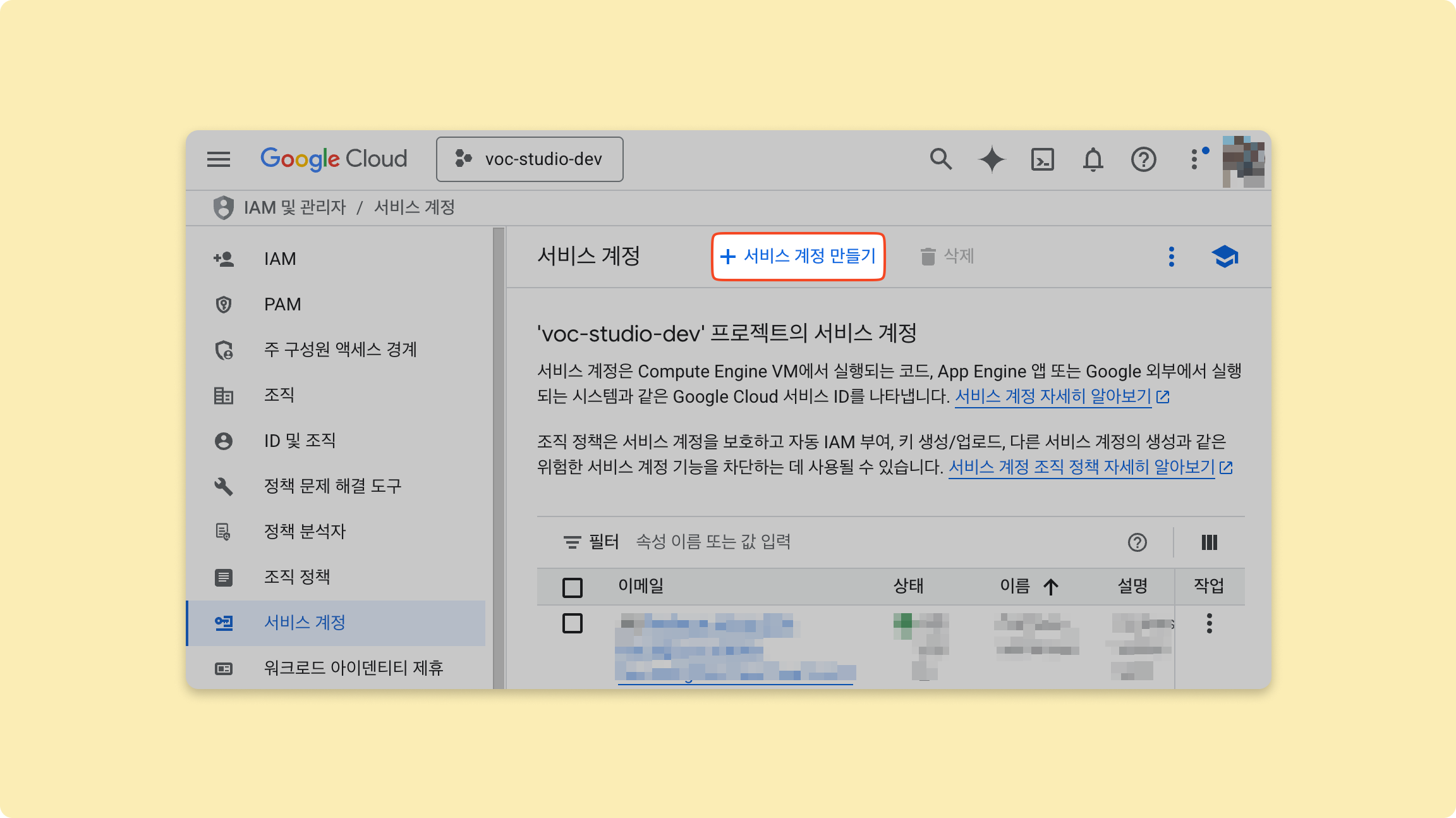 서비스 계정 만들기를 클릭해주세요.