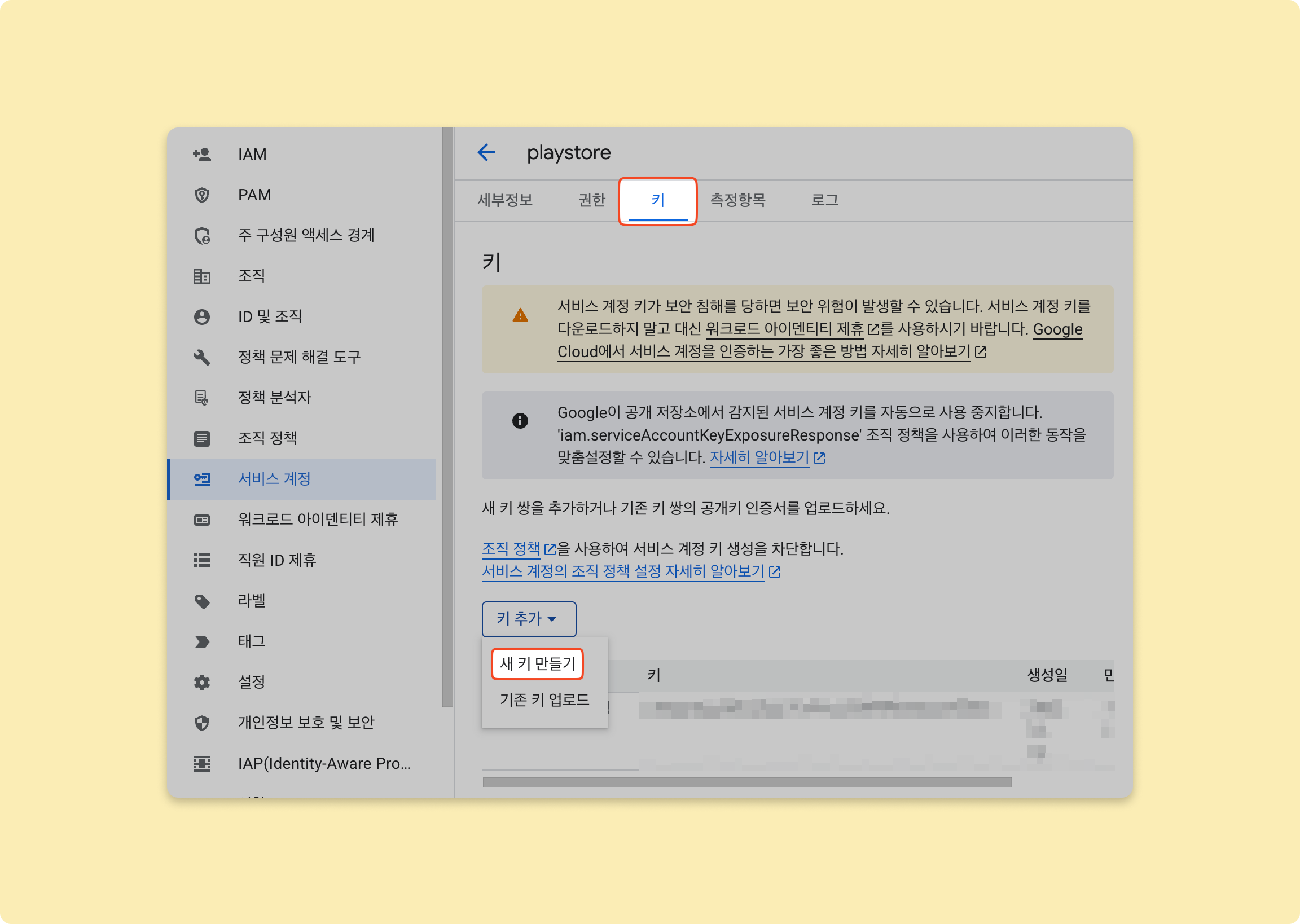 키탭에서키 추가를 클릭해새 키 만들기를 선택하세요.