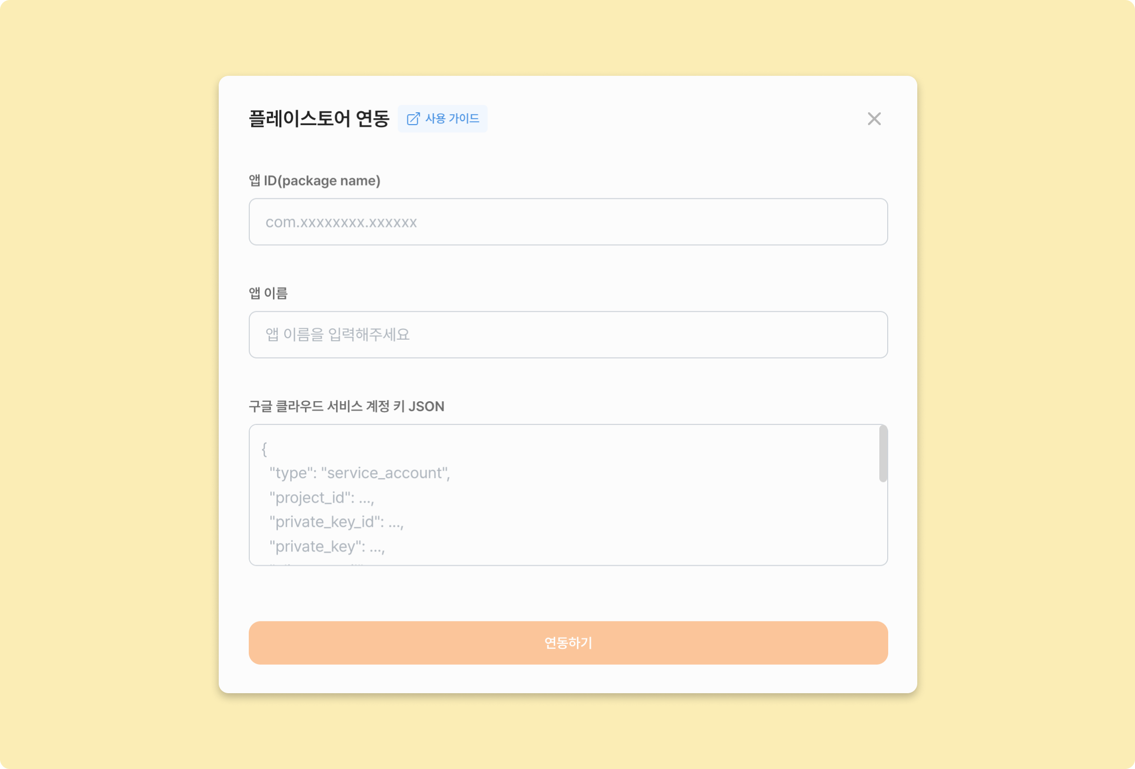 연동 채널명필드에 이 이름이 표시될 거예요. 출시된 앱 이름과 꼭 똑같아야 하는 건 아니고, 구별하기 쉬운 이름이면 충분해요.구글 클라우드 서비스 계정 키 JSON: Step 2에서 다운로드 받았던 JSON 파일을 열고 그 내용을 그대로 붙여넣어 주세요.