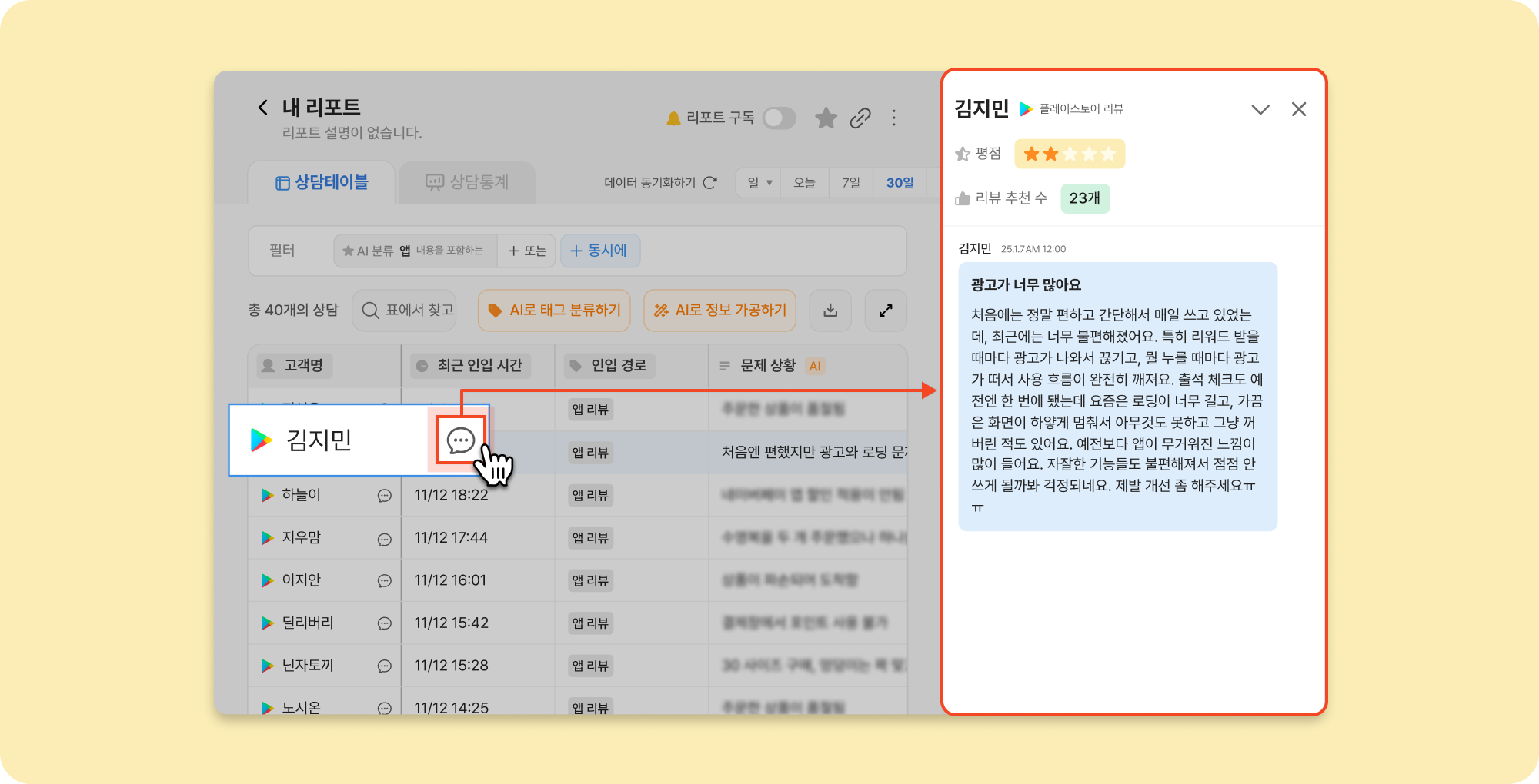 상담 테이블에서 고객명 옆에 표시되는 말풍선 아이콘을 눌러서 리뷰 내용과 평점을 빠르게 확인할 수도 있어요.