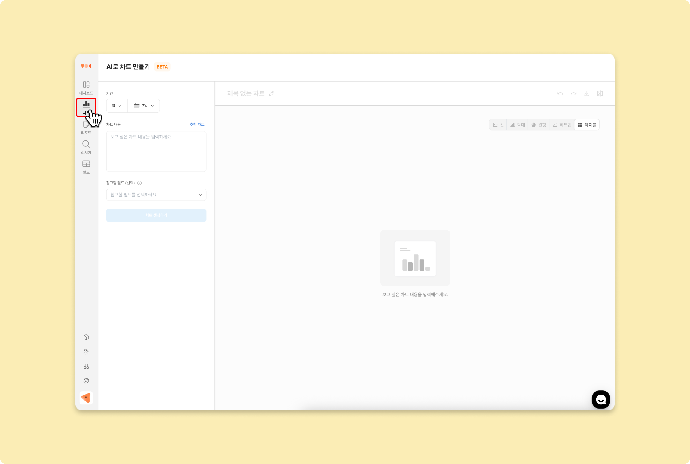 AI로 차트 만들기는 베타 서비스로 추가 비용 없이 무료 제공되는 기능이에요. 아직 완벽하게 다듬어지지 않은 기능이기 때문에 문제점이 조금씩 발견될 수 있어요.
