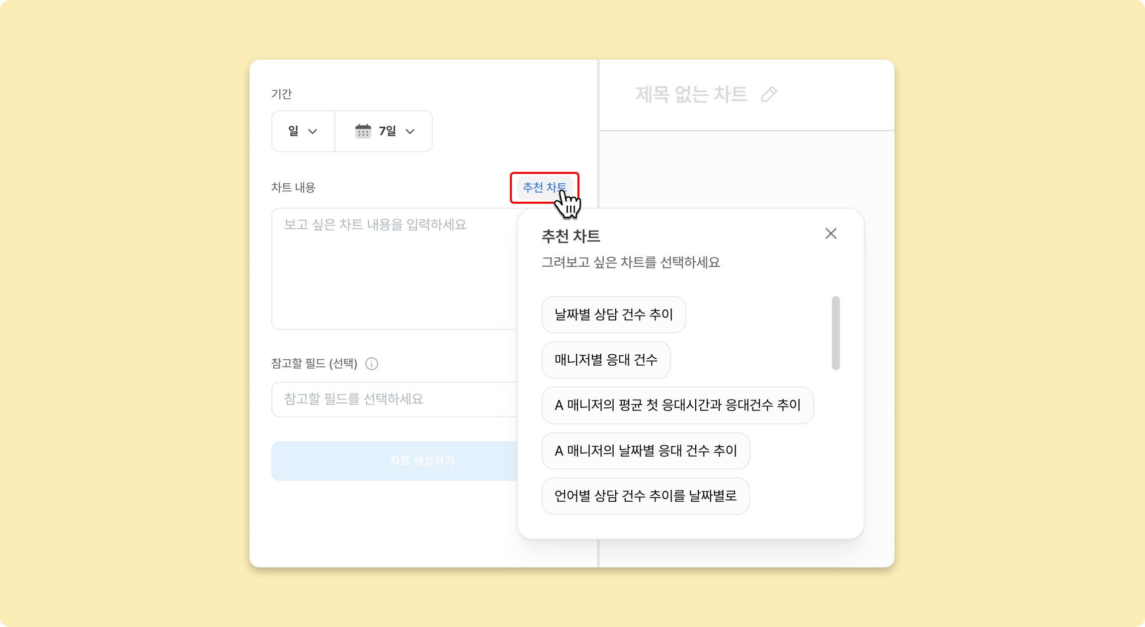 AI로 차트 만들기는 AI의 도움을 받아 쉽고 편리하게 차트를 만들어낼 수 있는 기능이에요. 지표 산출 방식을 복잡하게 일일이 지정할 필요 없이, 클릭 몇 번과 간단한 설명 입력만으로 CX팀에 필요한 지표를 시각화해보세요.