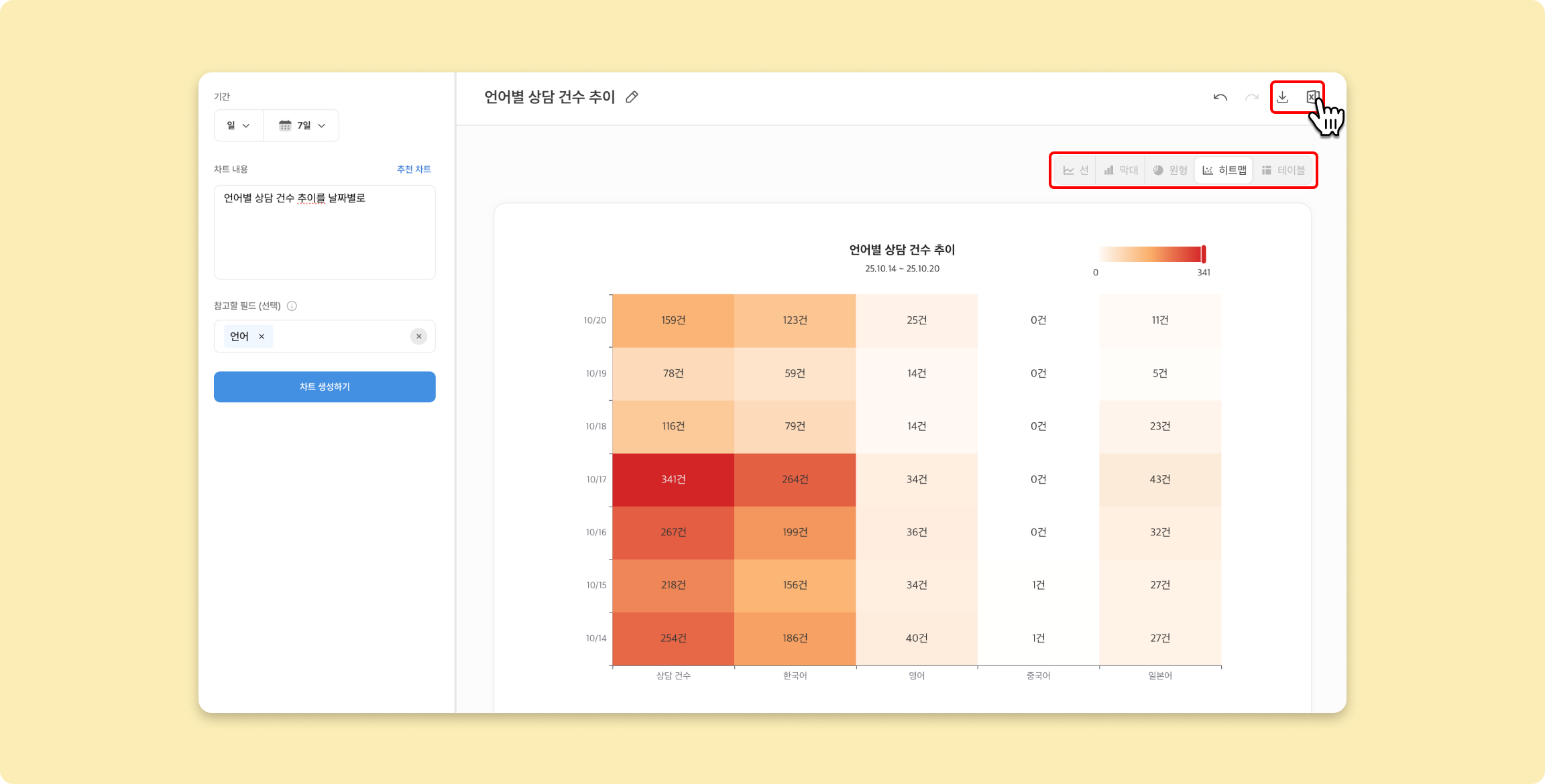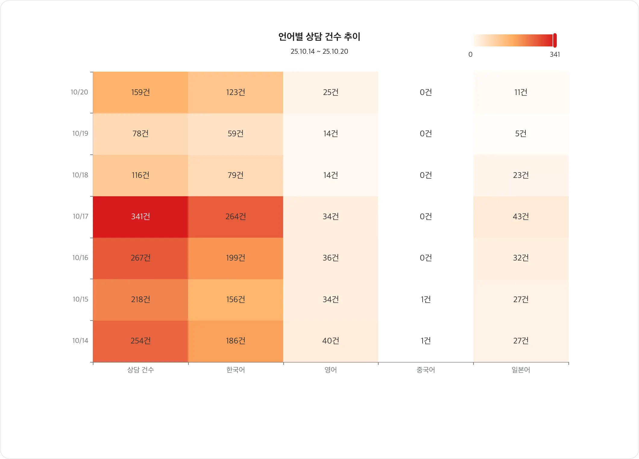 차트 내용: 언어별 상담 건수 추이를 날짜별로