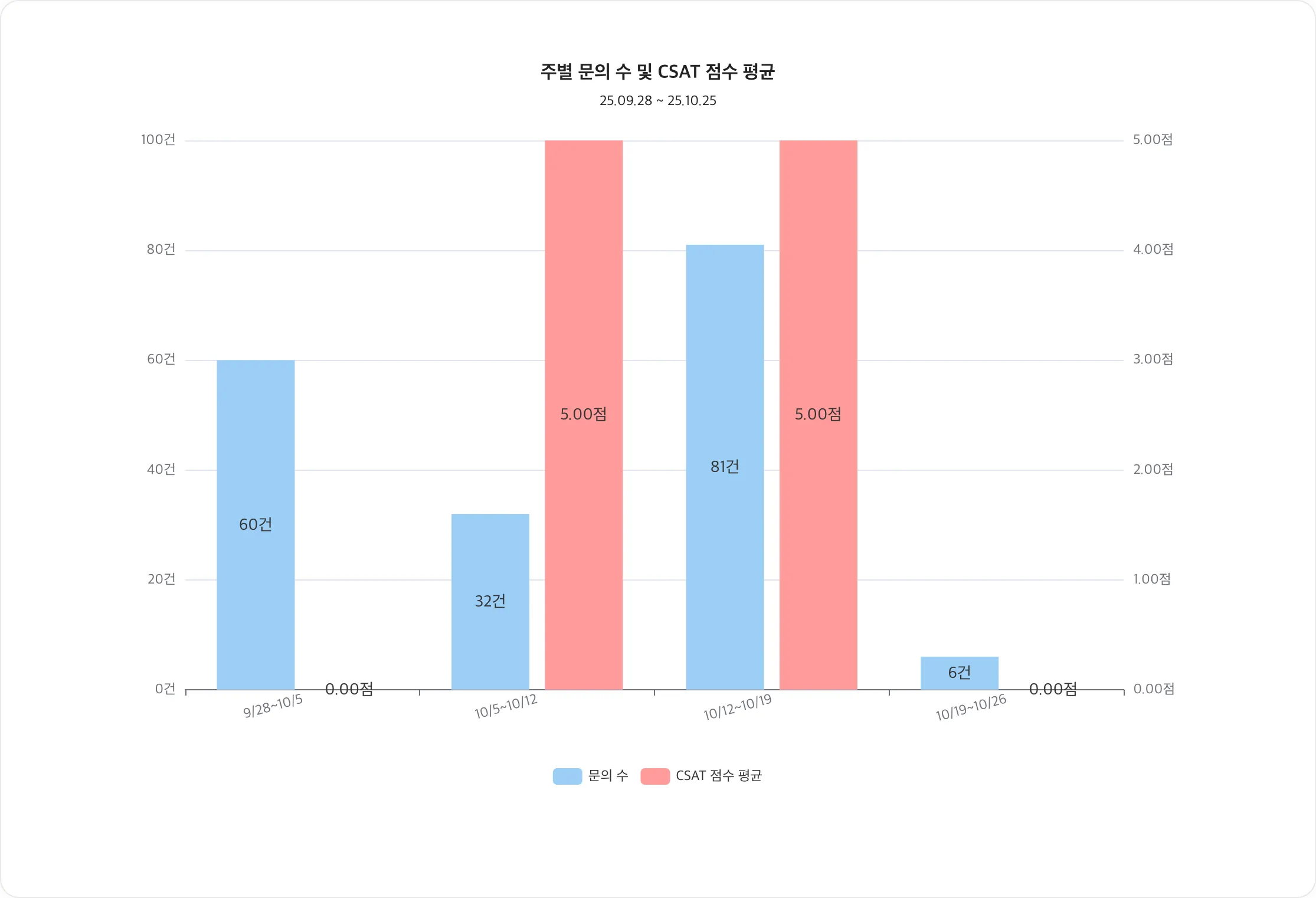 차트 내용: 주별 문의 수와 CSAT 점수 함께 표시