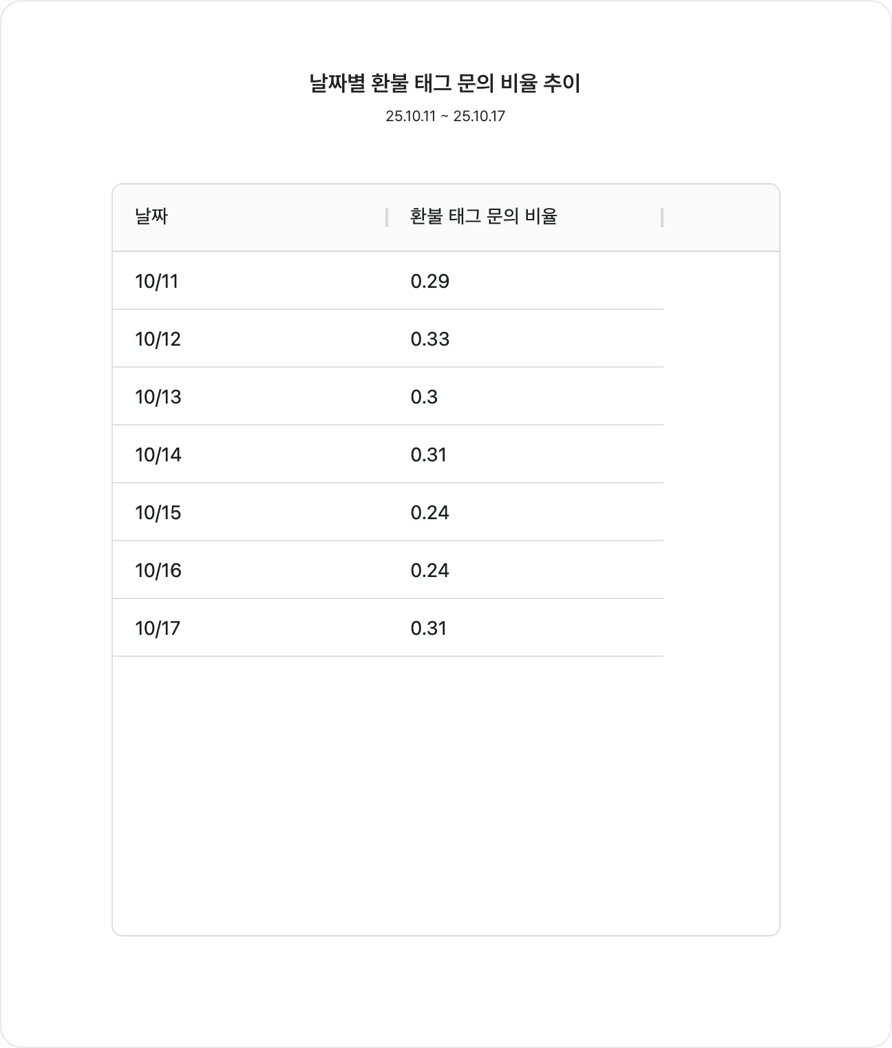 차트 내용: 날짜별로 전체 문의 중 '환불' 태그의 문의가 차지하는 비율 추이
