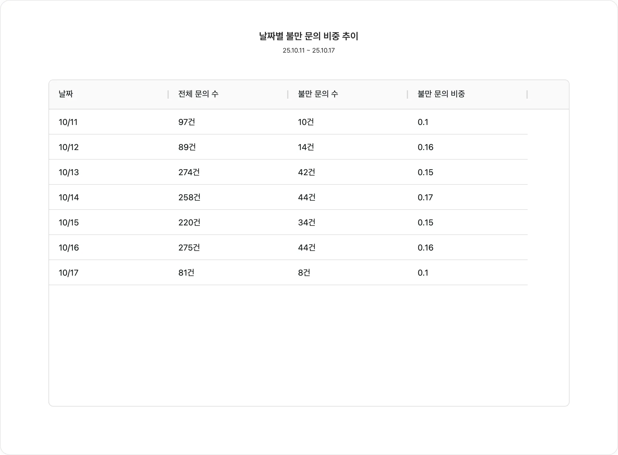 차트 내용: 날짜별 불만 문의 비중 추이