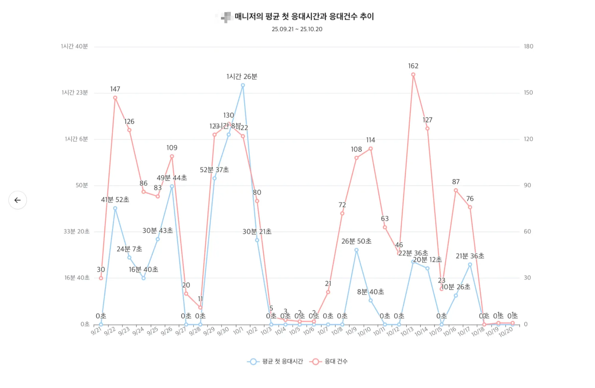 차트 내용: [매니저 이름] 매니저의 응대 건수와 평균 첫 응대 시간 추이