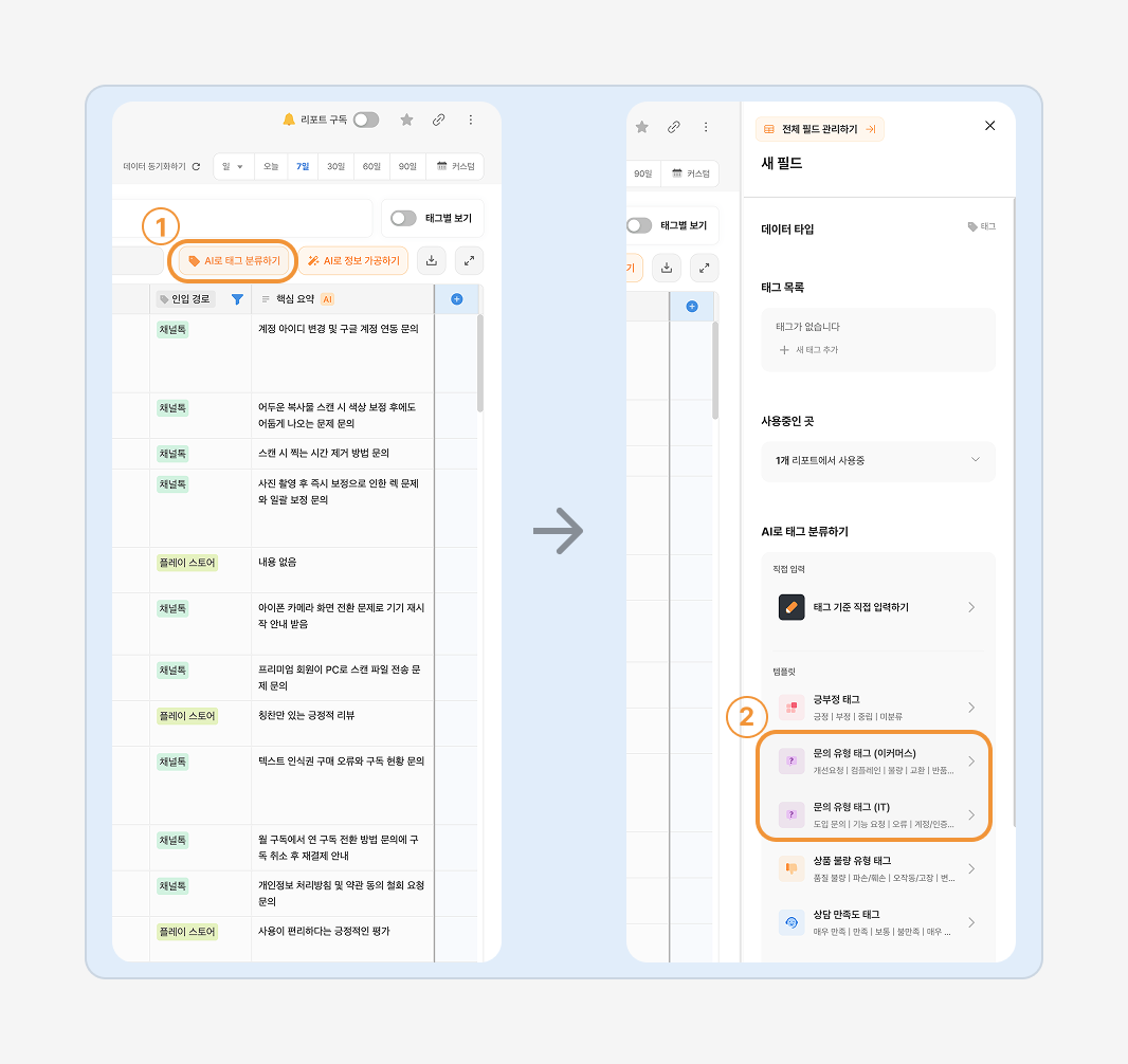 AI 태그 분류하기를 사용해서 기존의 분류 필드보다 우리팀에 더 알맞은 태그 분류 체계를 쉽게 사용할 수 있어요.아래의 가이드를 따라