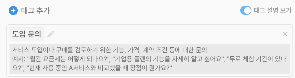 태그 추가버튼을 눌러 태그를 추가하거나, 이미 있는 태그를x버튼으로 지울 수 있어요.태그 설명을 클릭하면 구체적인 내용을 우리 팀에 맞춰 바꿀 수 있어요.