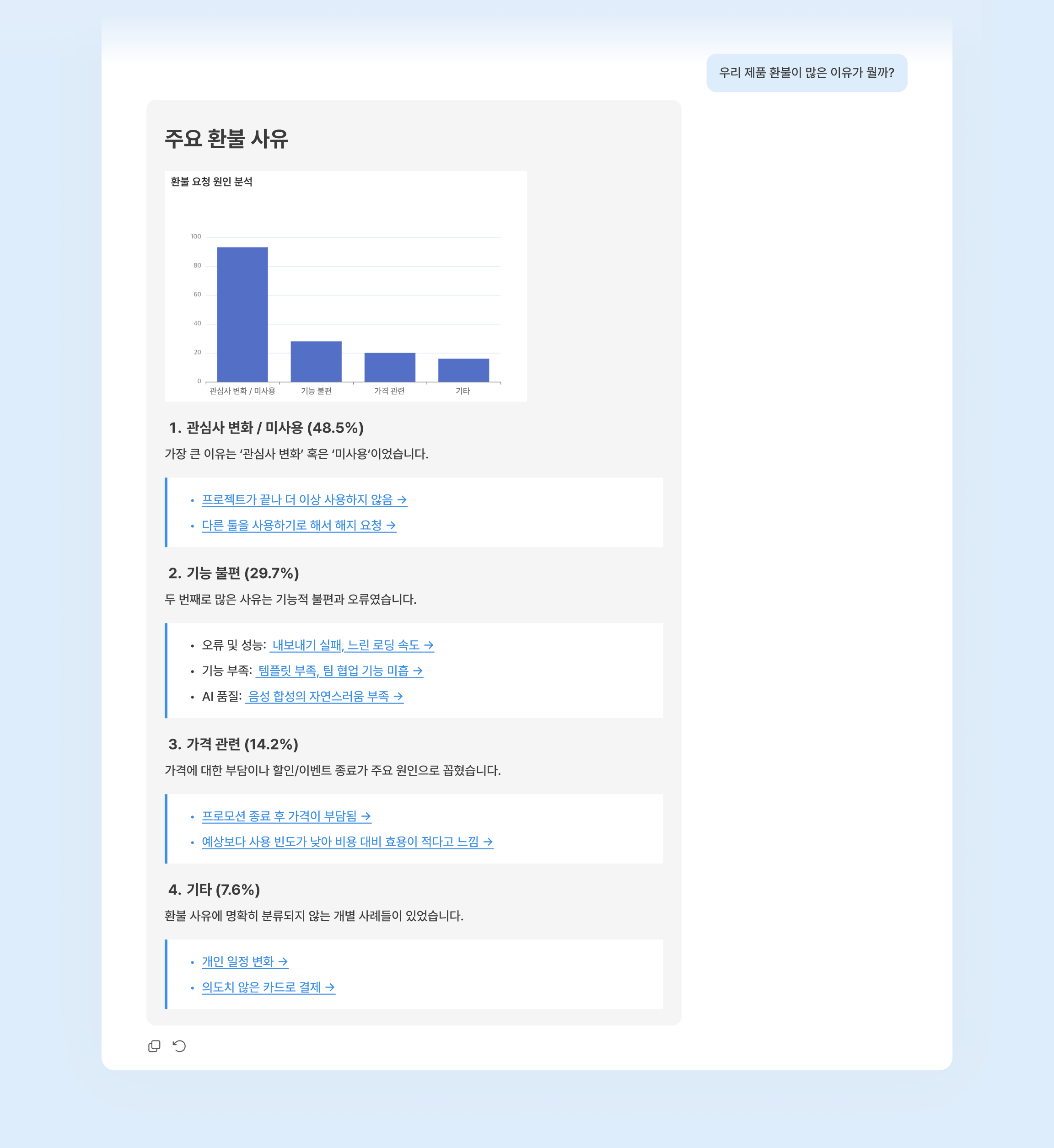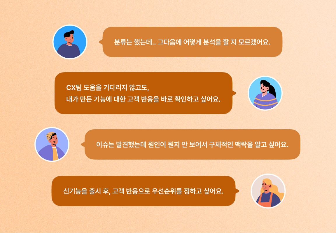 복잡한 분석 과정 없이도 AI와 대화하며 수많은 VOC에서 원하는 인사이트를 발견할 수 있어요.