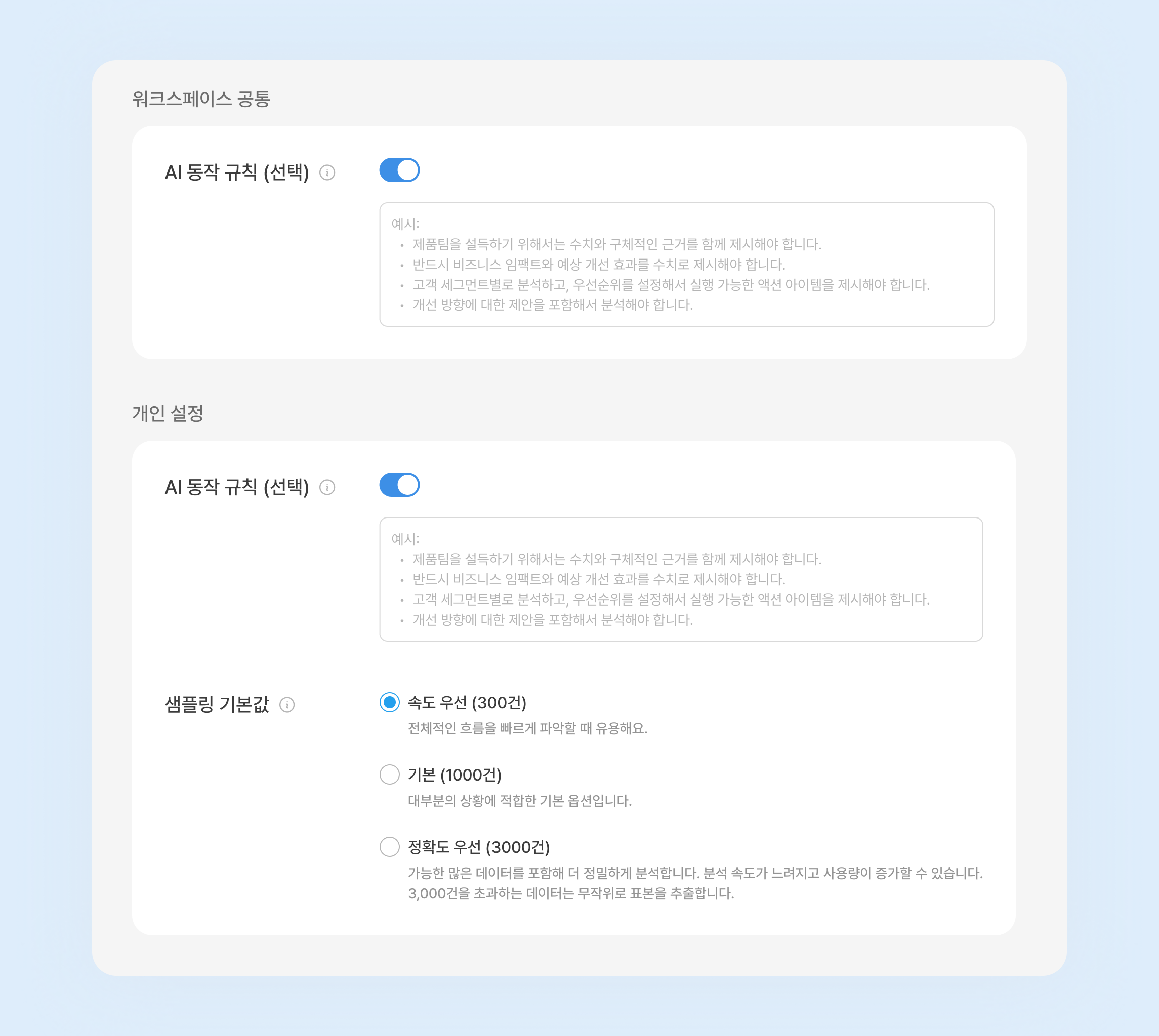 워크스페이스에서 공유해서 사용할 AI 동작 규칙을 설정할 수 있어요.