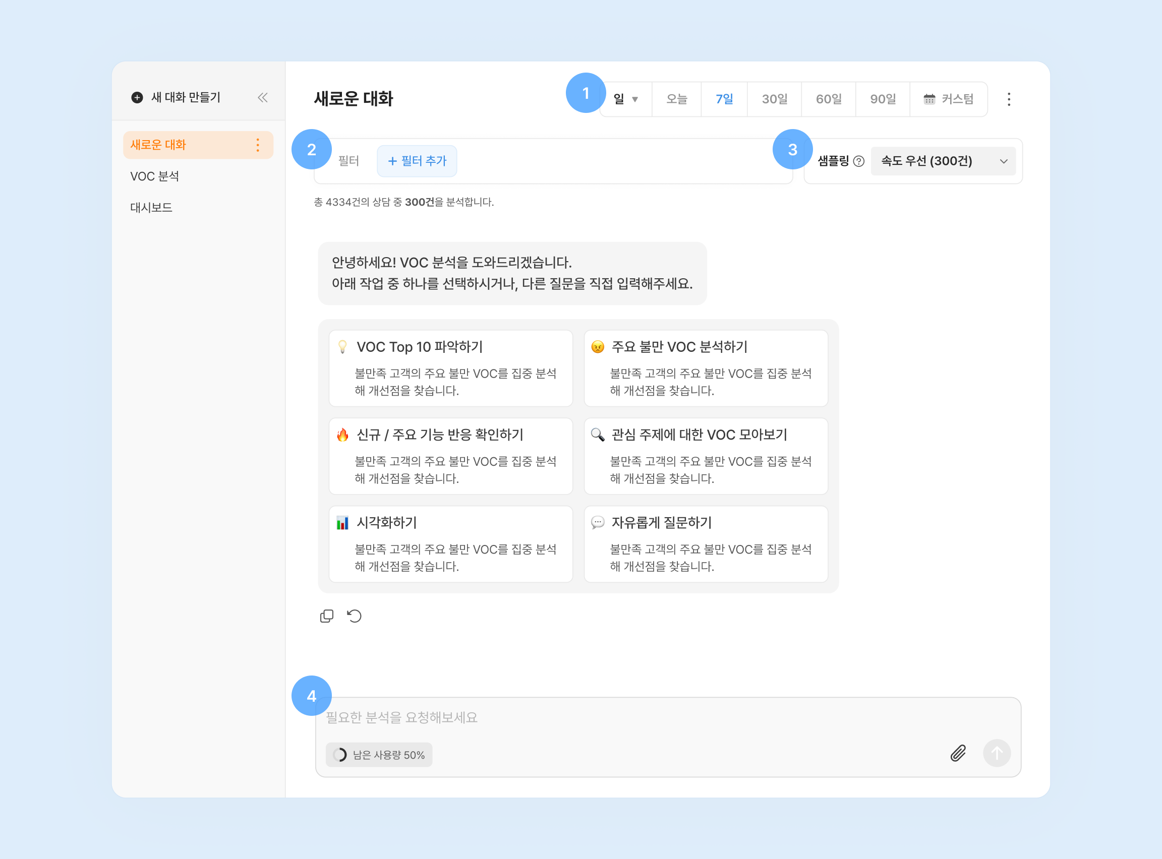 한 번의 분석에 포함할 VOC 데이터 건수를 고를 수 있어요.