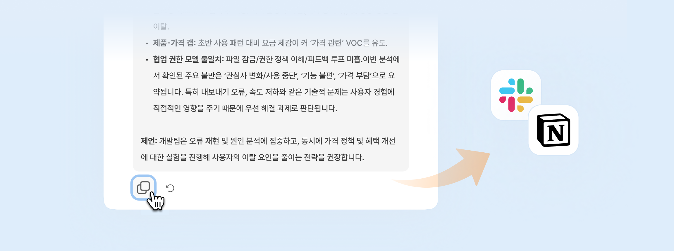 AI의 답변은 바로 복사해서 노션이나 슬랙으로 공유할 수 있어요.